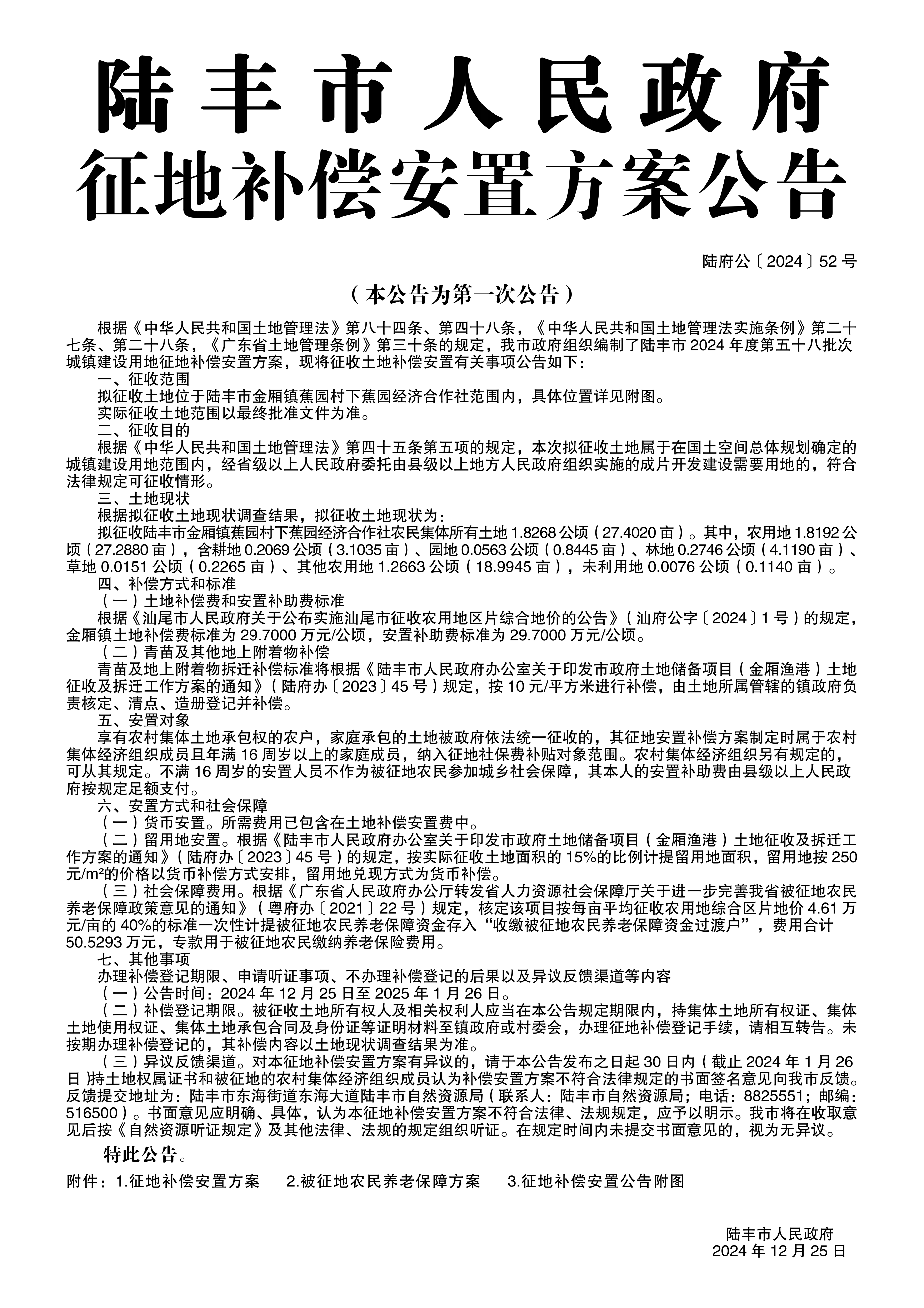 陸豐市人民政府關(guān)于征收土地補(bǔ)償安置方案的公告(陸府公〔2024〕52號(hào))