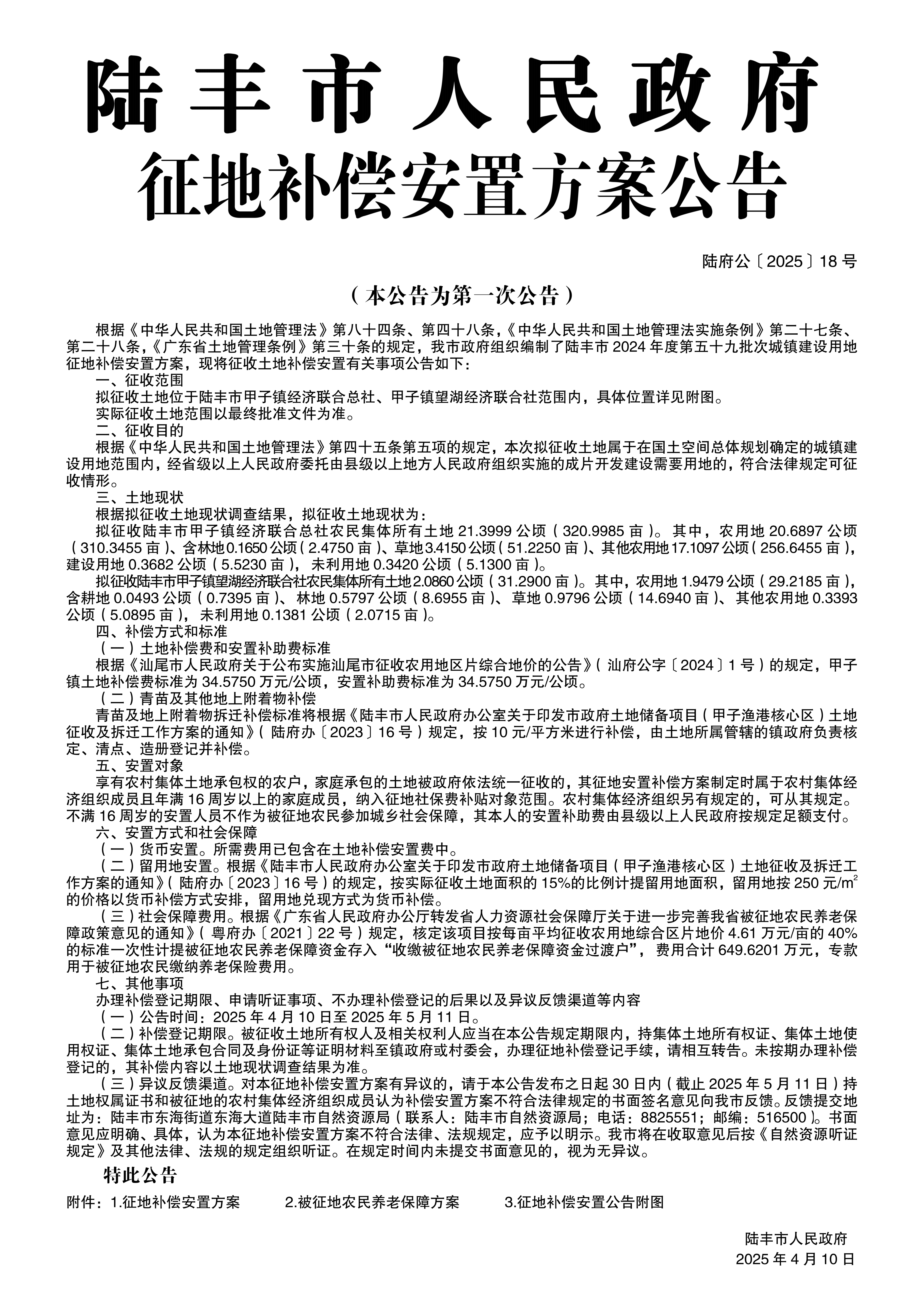 陸豐市人民政府土地補(bǔ)償安置方案公告(陸府公〔2025〕18號(hào))24年五十九批