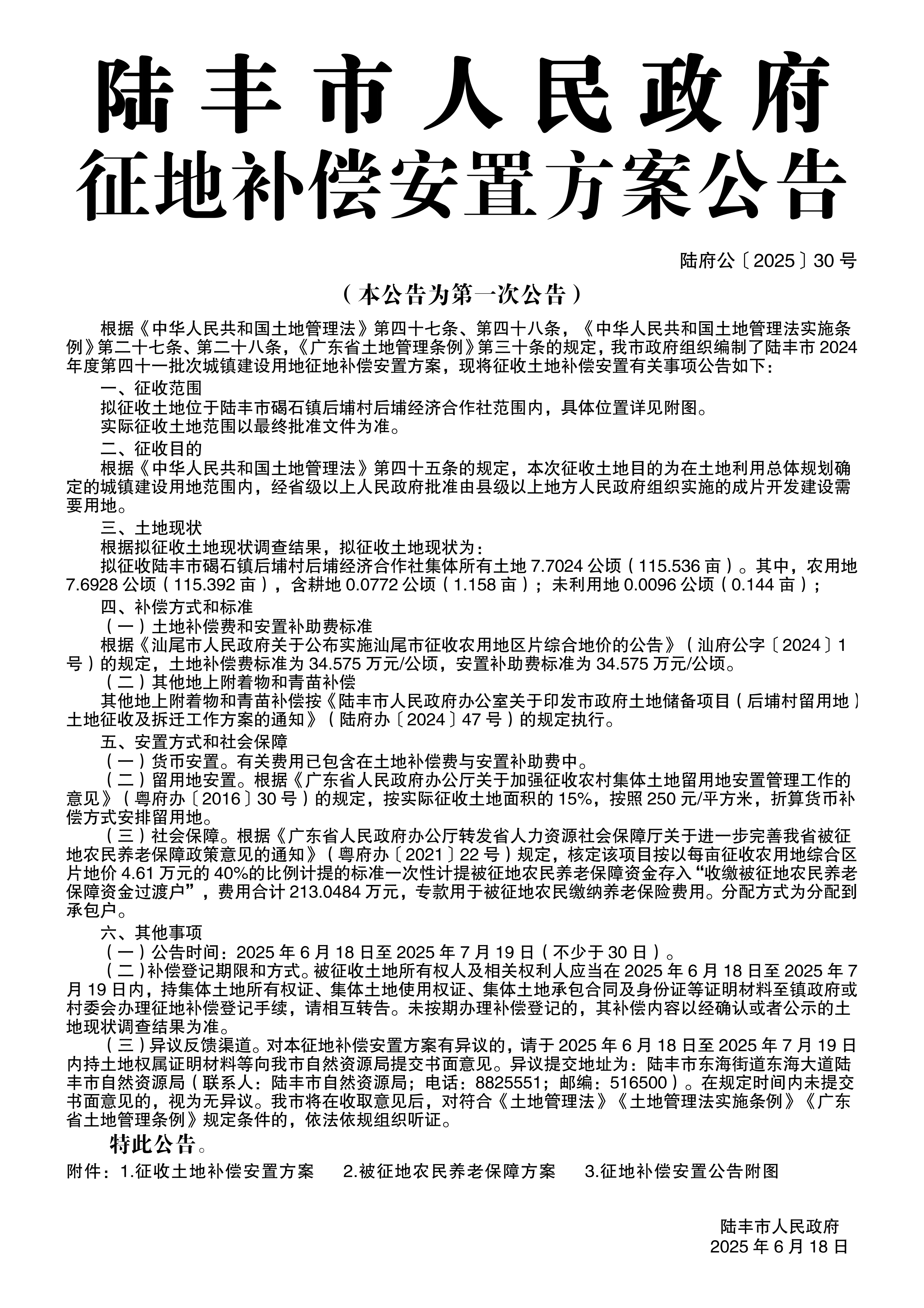 陸豐市人民政府土地補(bǔ)償安置方案公告(陸府公〔2025〕30號)