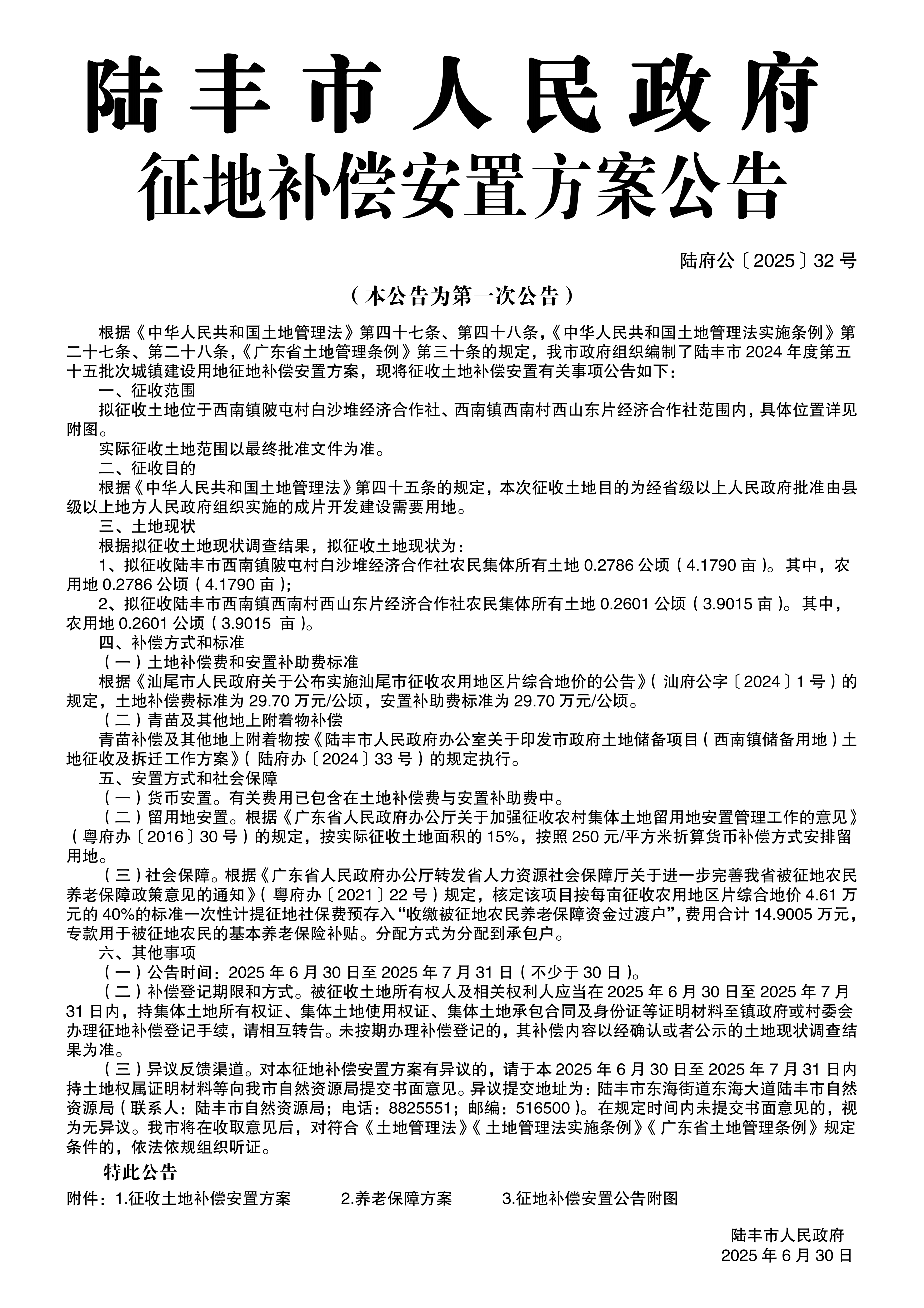 陸豐市人民政府土地補(bǔ)償安置方案公告(陸府公〔2025〕32號(hào))