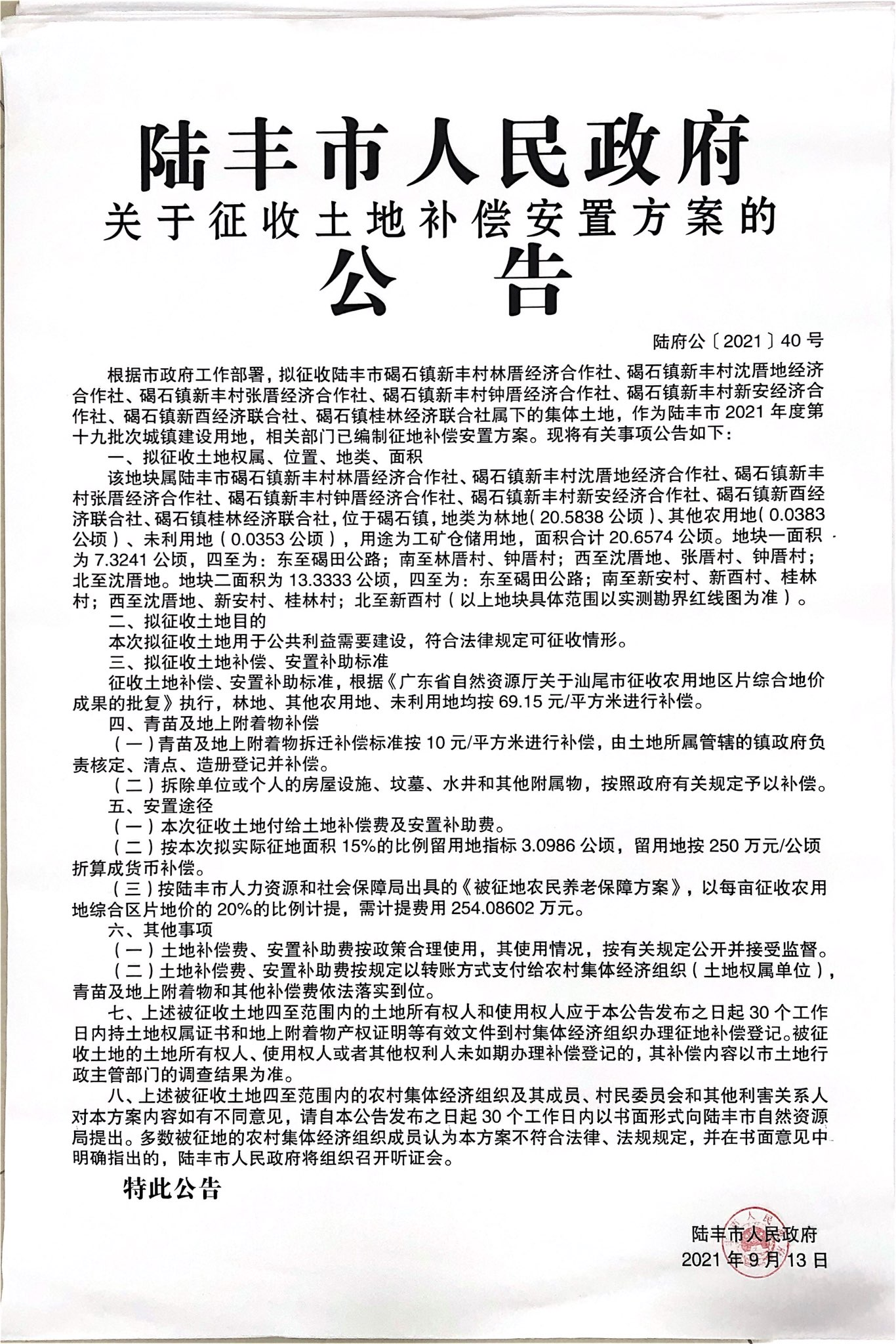 陸豐市人民政府關(guān)于征收土地補(bǔ)償安置方案的公告(陸府公[2021]40號(hào))