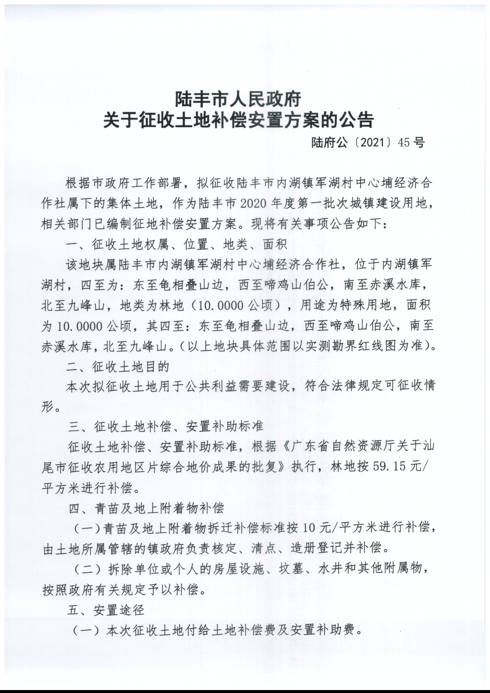 陸豐市人民政府關(guān)于征收土地補(bǔ)償安置方案的公告(陸府公〔2021〕45號(hào))