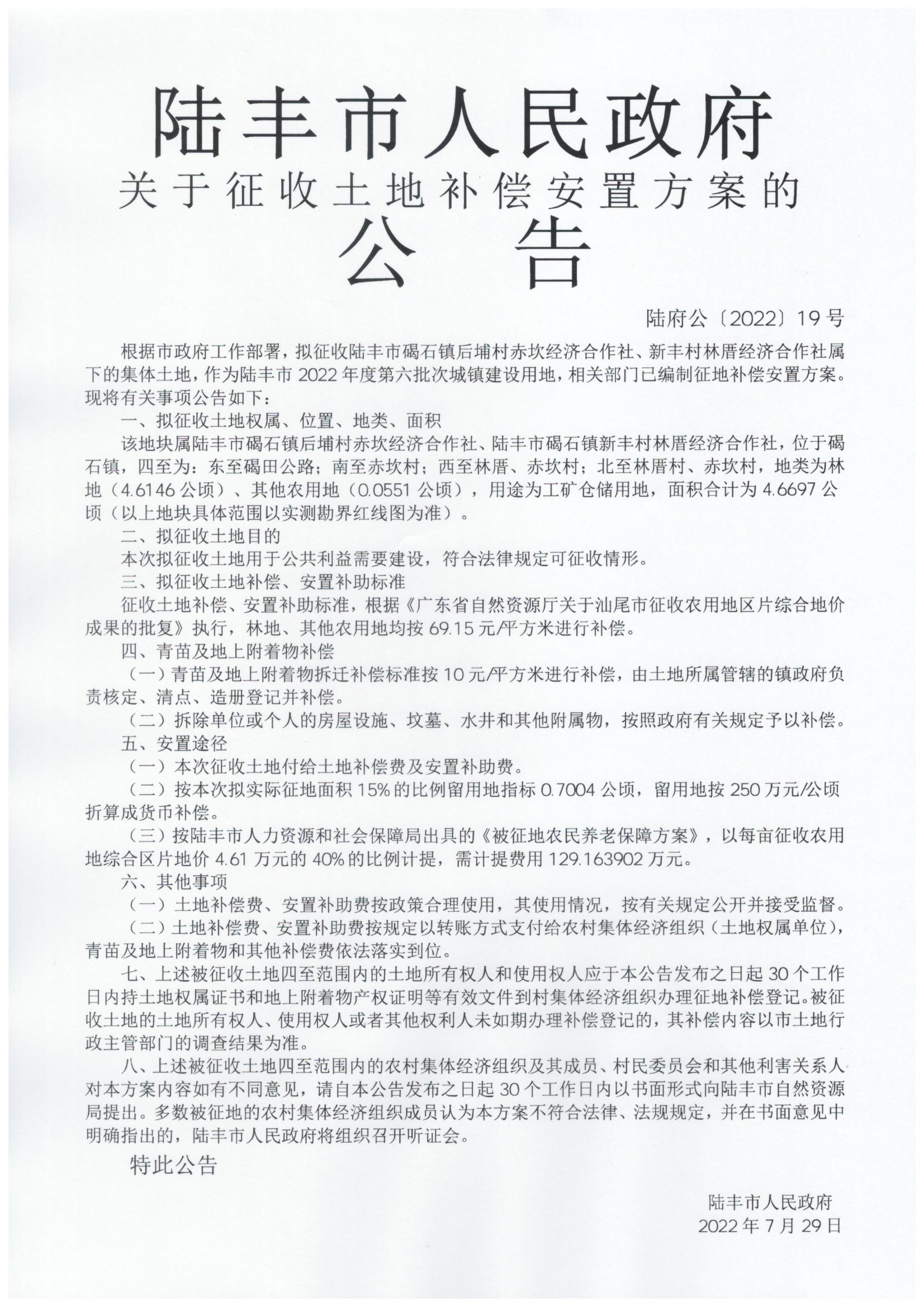 陸豐市人民政府關(guān)于征收土地補(bǔ)償安置方案的公告(陸府公[2022]19號)