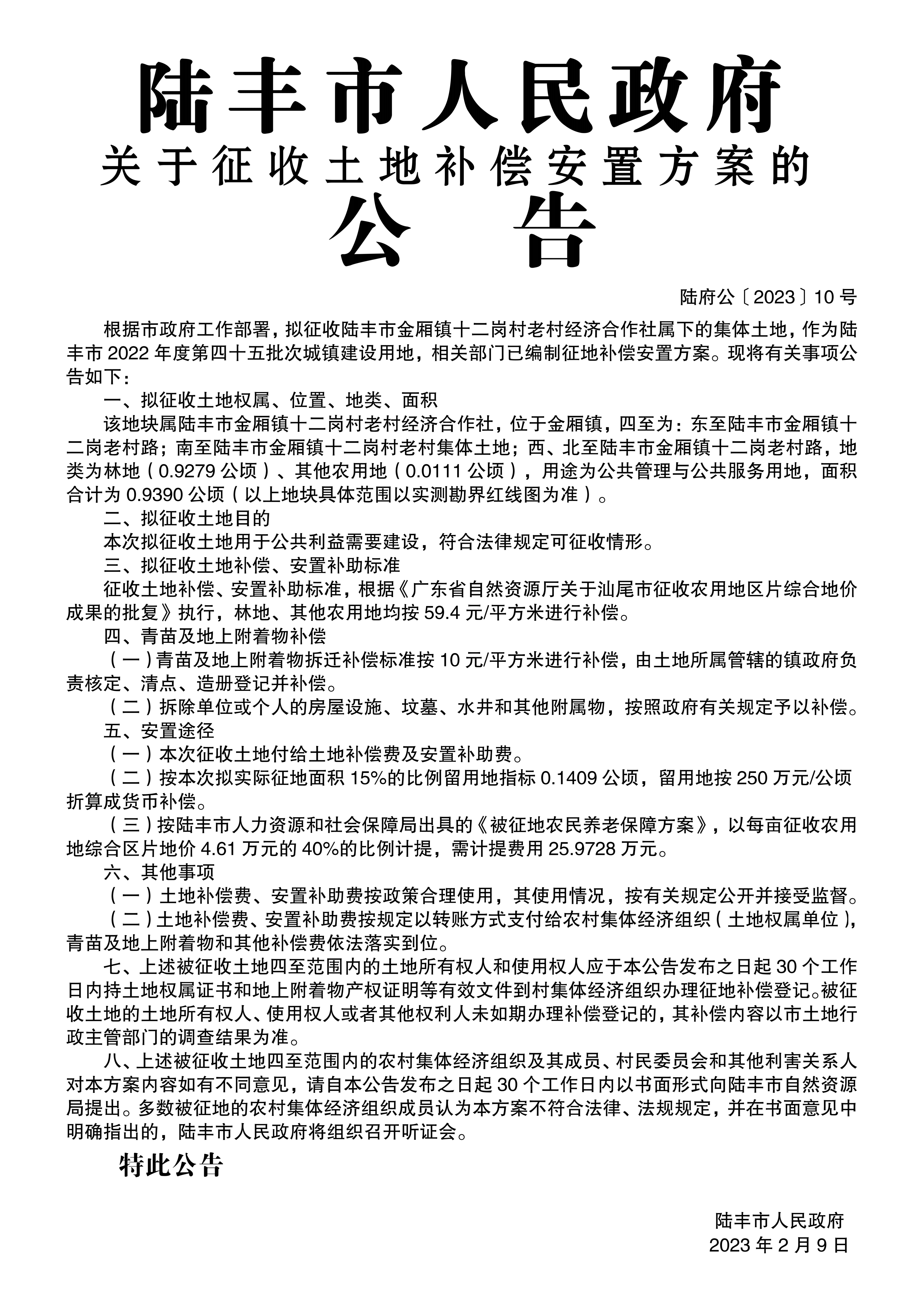 陸豐市人民政府關于征收土地補償安置方案的公告(陸府公〔2023〕10號)