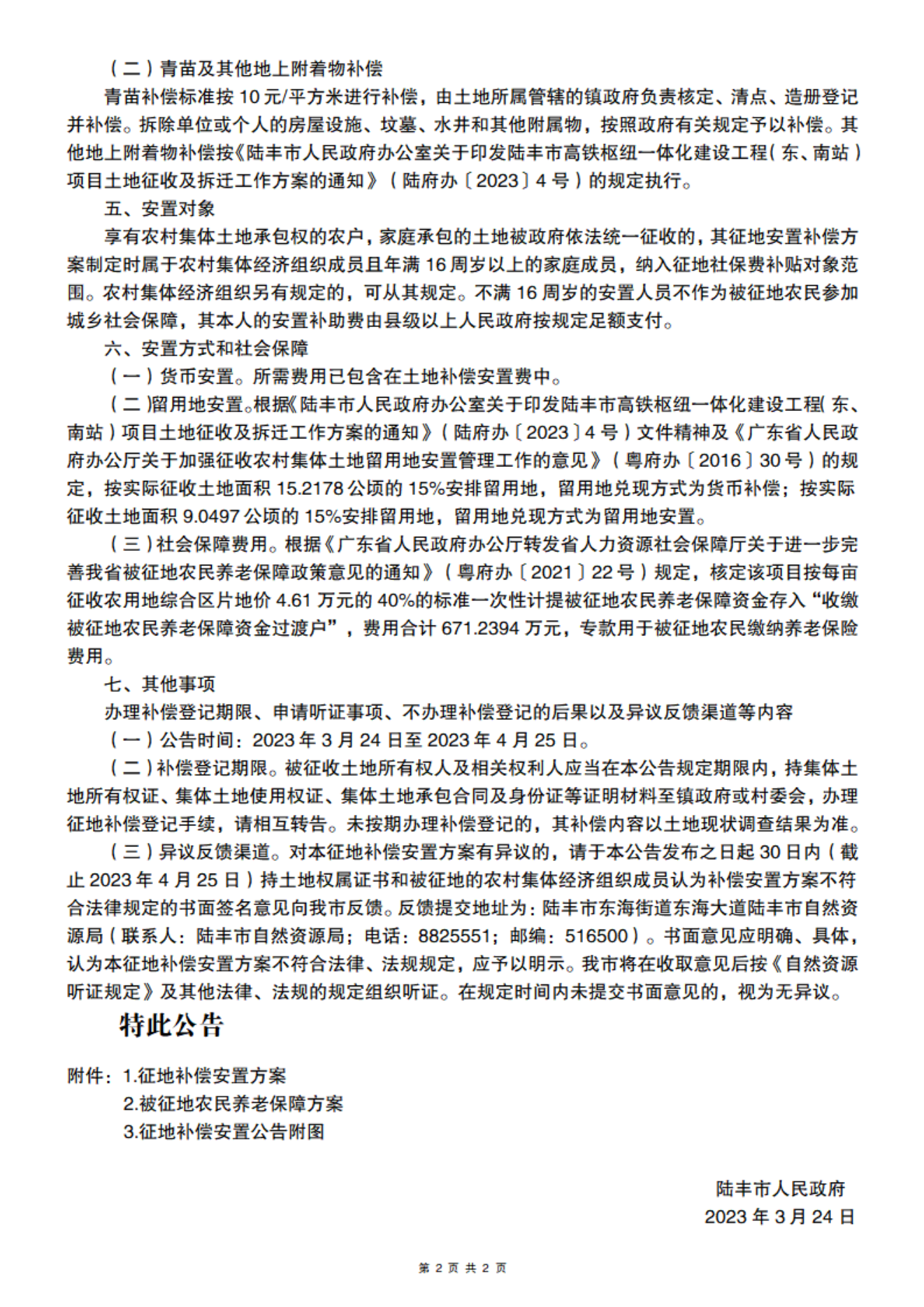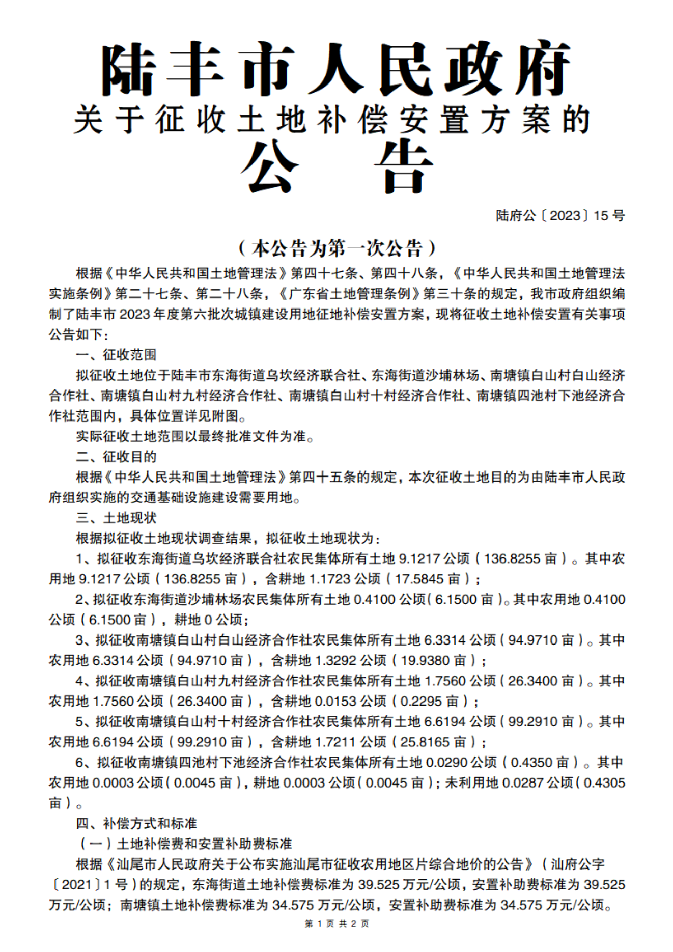 陸豐市人民政府關(guān)于征收土地補(bǔ)償安置方案的公告(陸府公〔2023〕15號(hào))