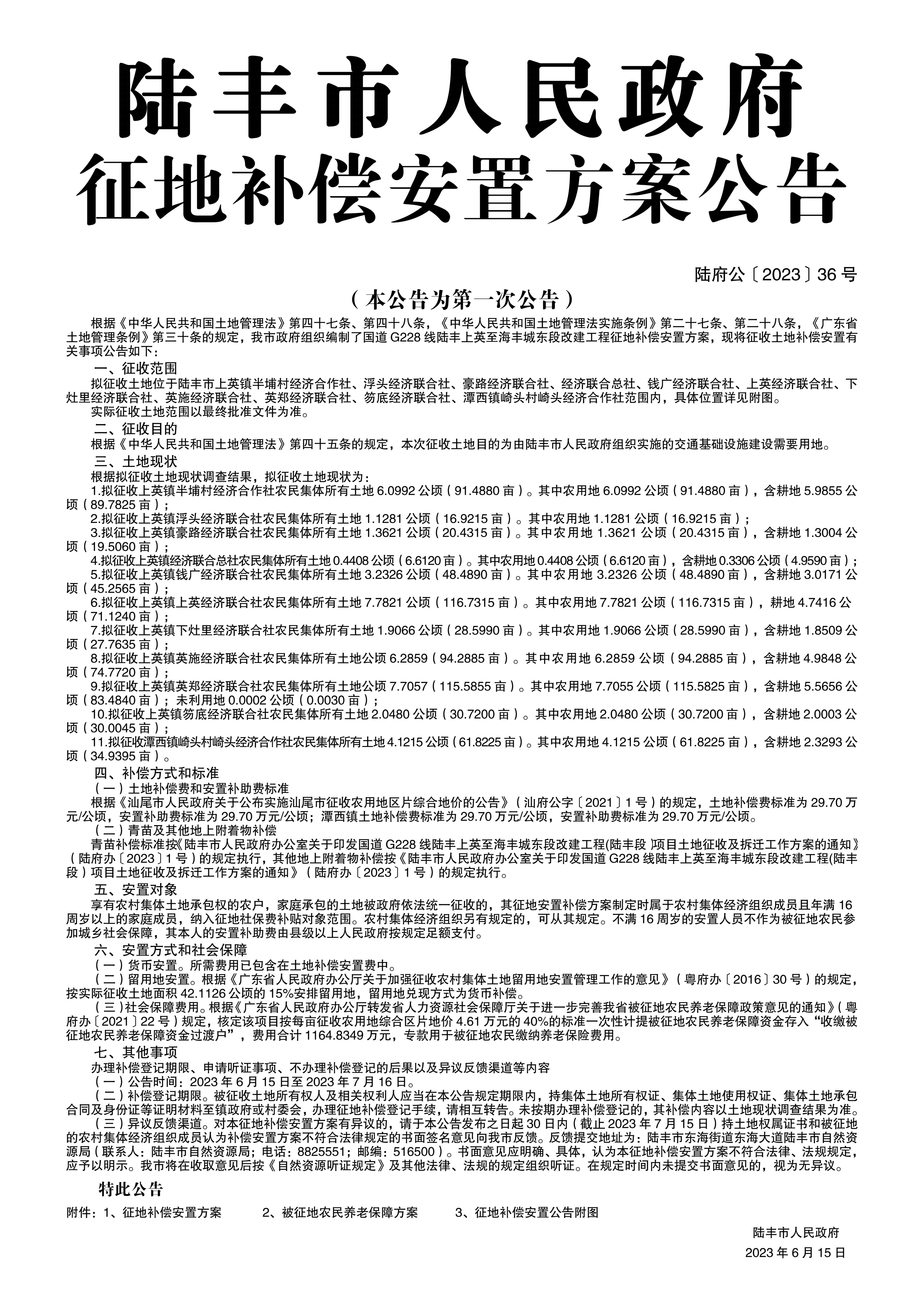 陸豐市人民政府關(guān)于征收土地補(bǔ)償安置方案的公告(陸府公〔2023〕36號(hào))