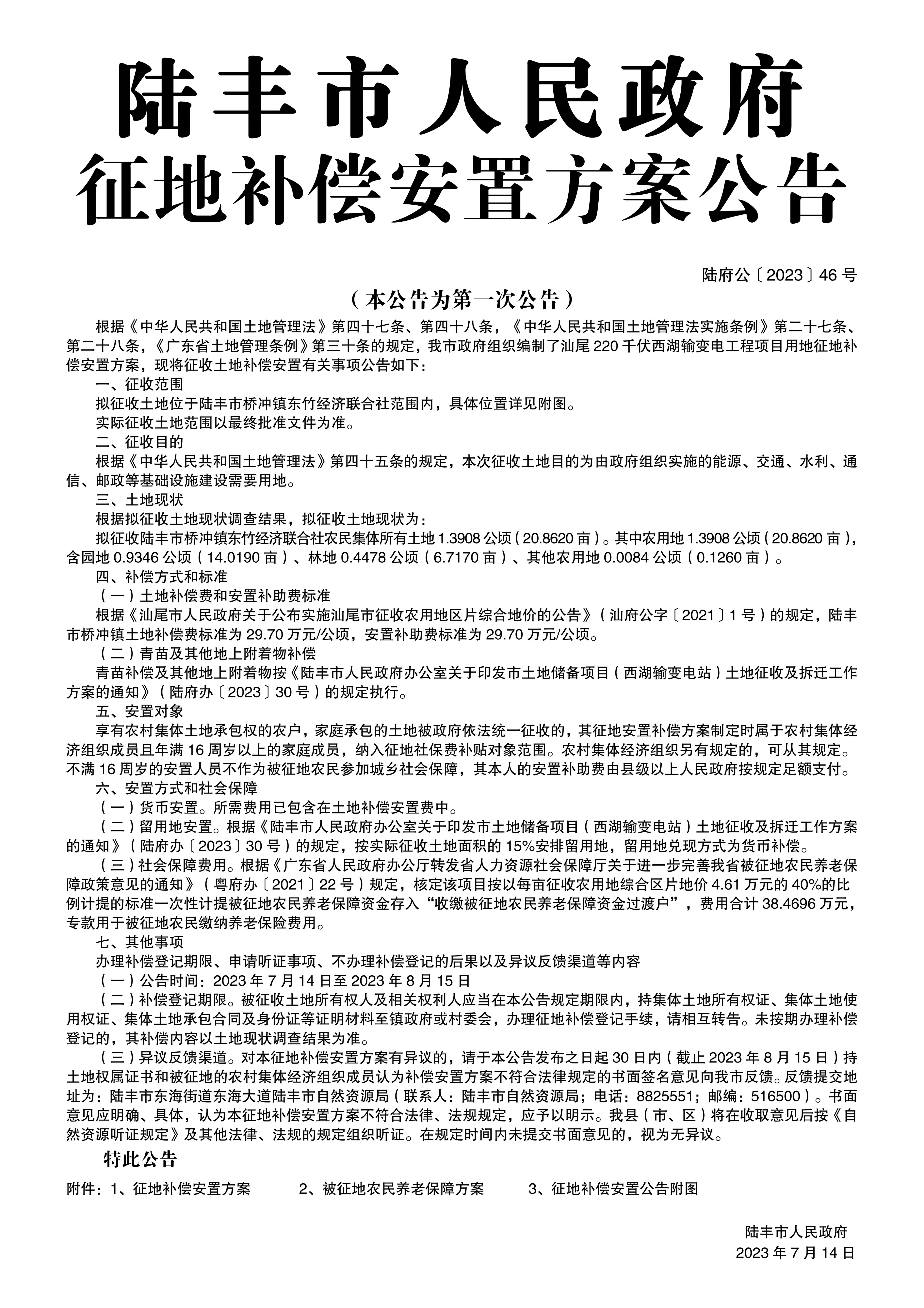 陸豐市人民政府關(guān)于征收土地補償安置方案的公告(陸府公〔2023〕46號)