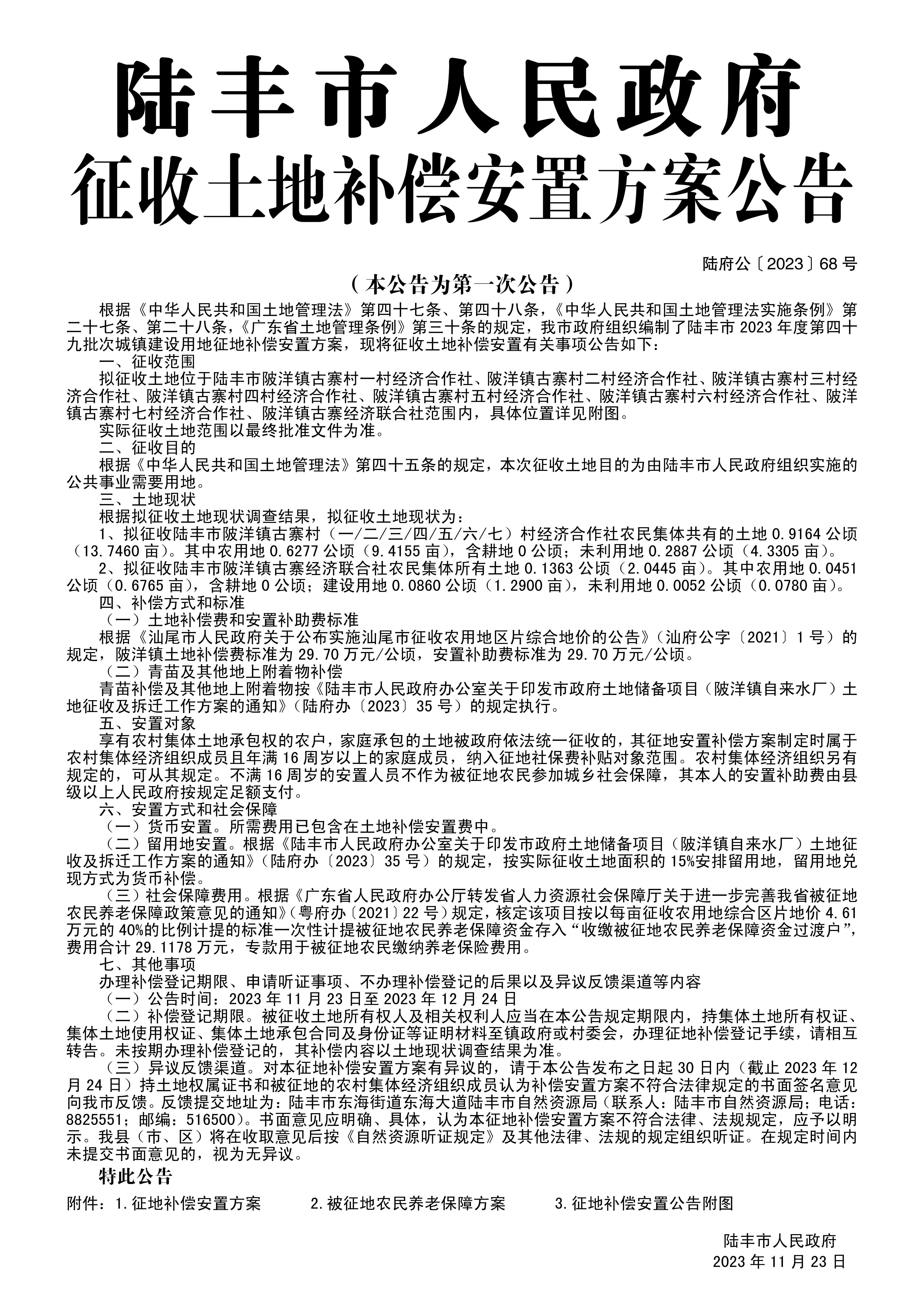 陸豐市人民政府關(guān)于征收土地補(bǔ)償安置方案的公告(陸府公〔2023〕68號)