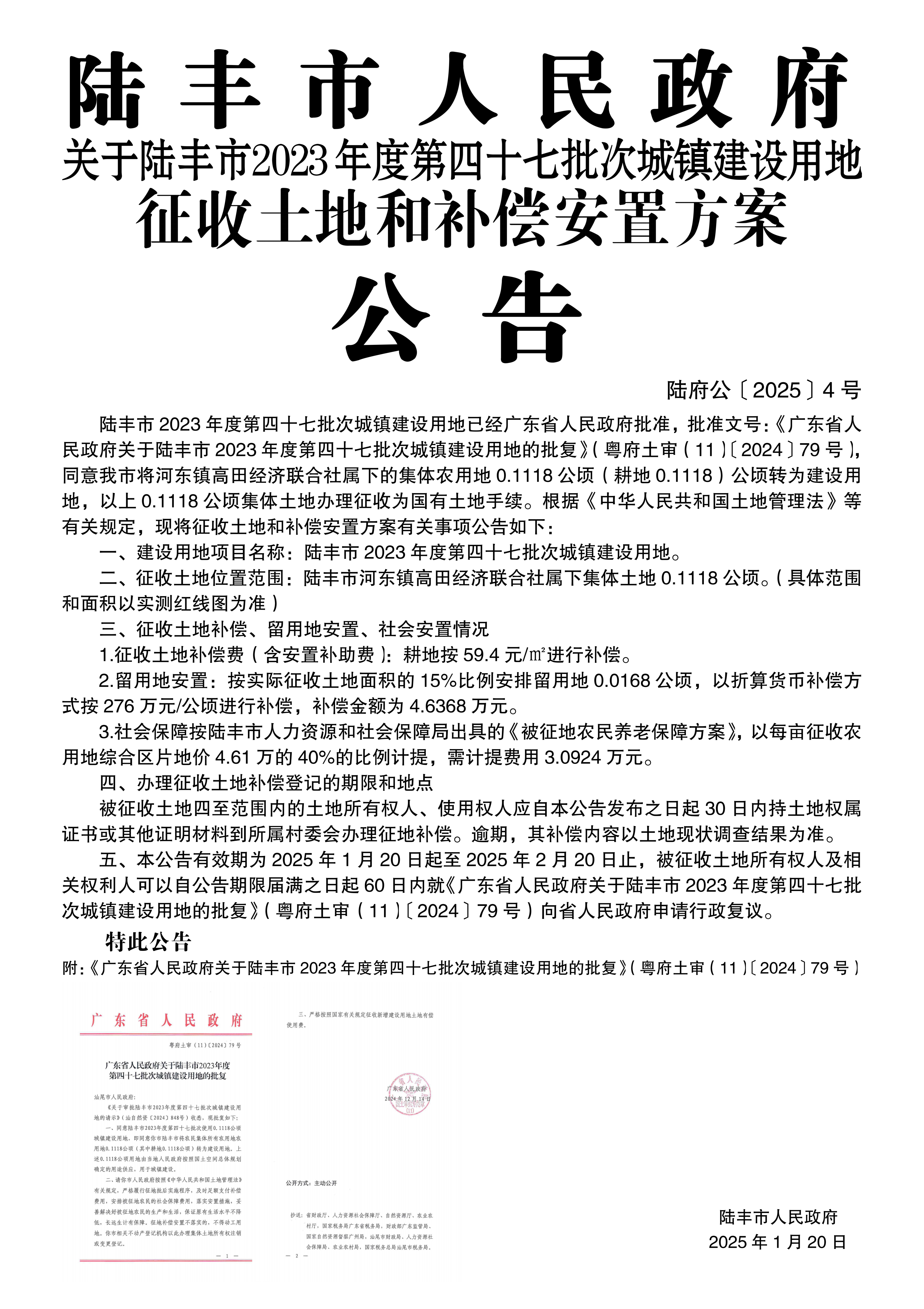 廣東省人民政府關(guān)于陸豐市 2023年度第四十七批次城鎮(zhèn)建設(shè)用地的批復(fù)(粵府土審(11)〔2024〕79號)