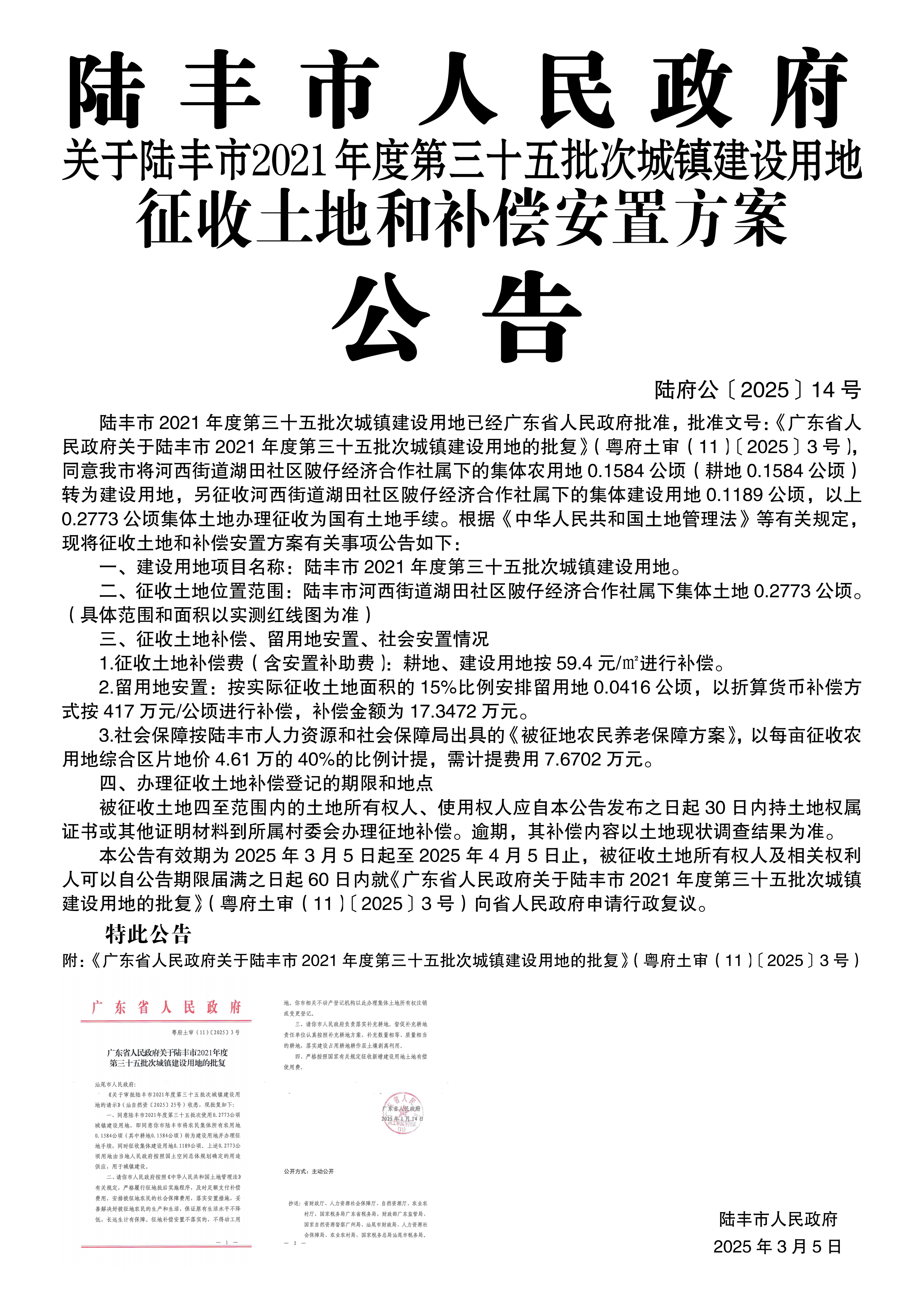 廣東省人民政府關(guān)于陸豐市 2021年度第三十五批次城鎮(zhèn)建設(shè)用地的批復(fù)(粵府土審(11)〔2025〕3號(hào))
