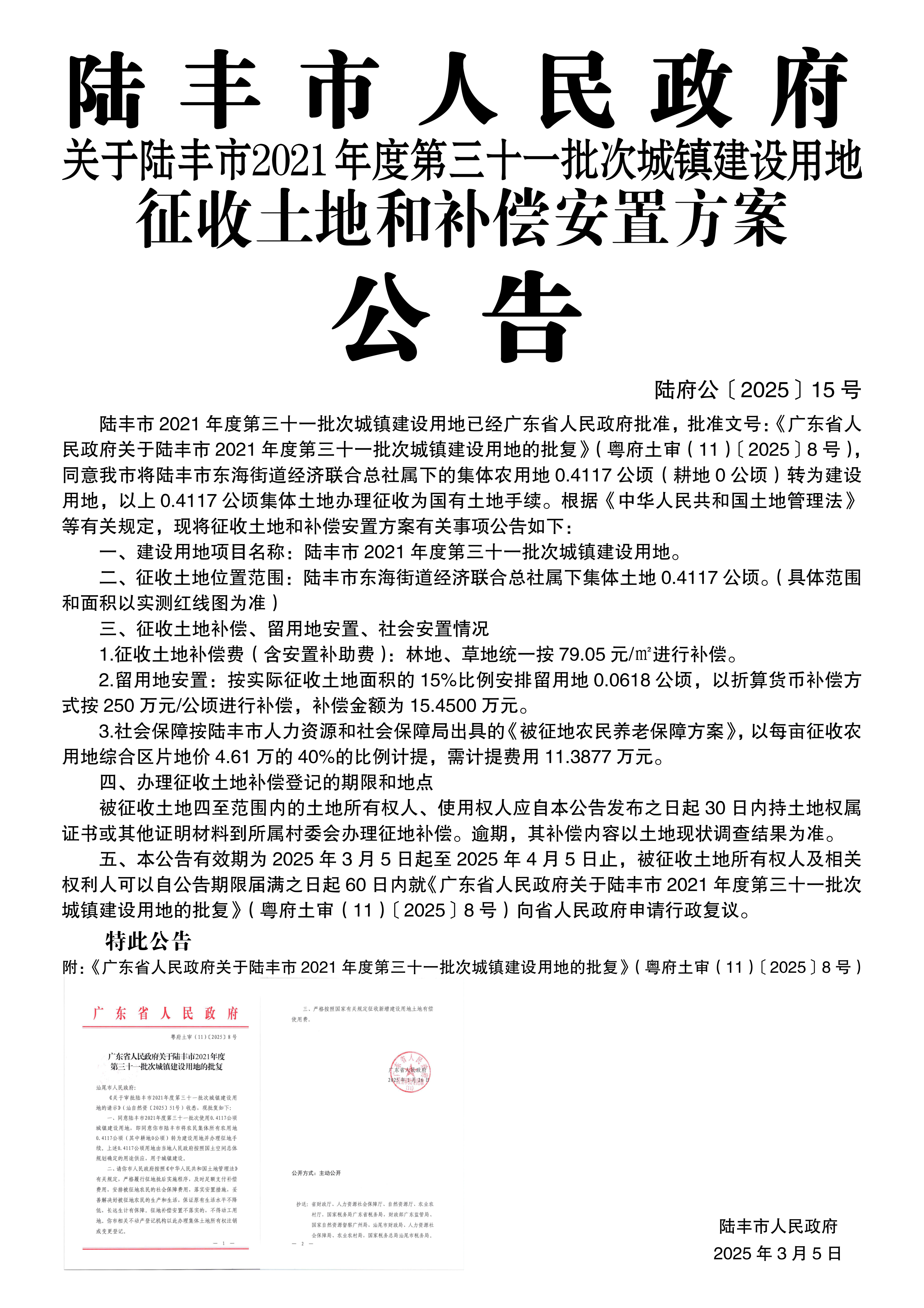 廣東省人民政府關于陸豐市 2021年度第三十一批次城鎮(zhèn)建設用地的批復(粵府土審(11)〔2025〕8號)
