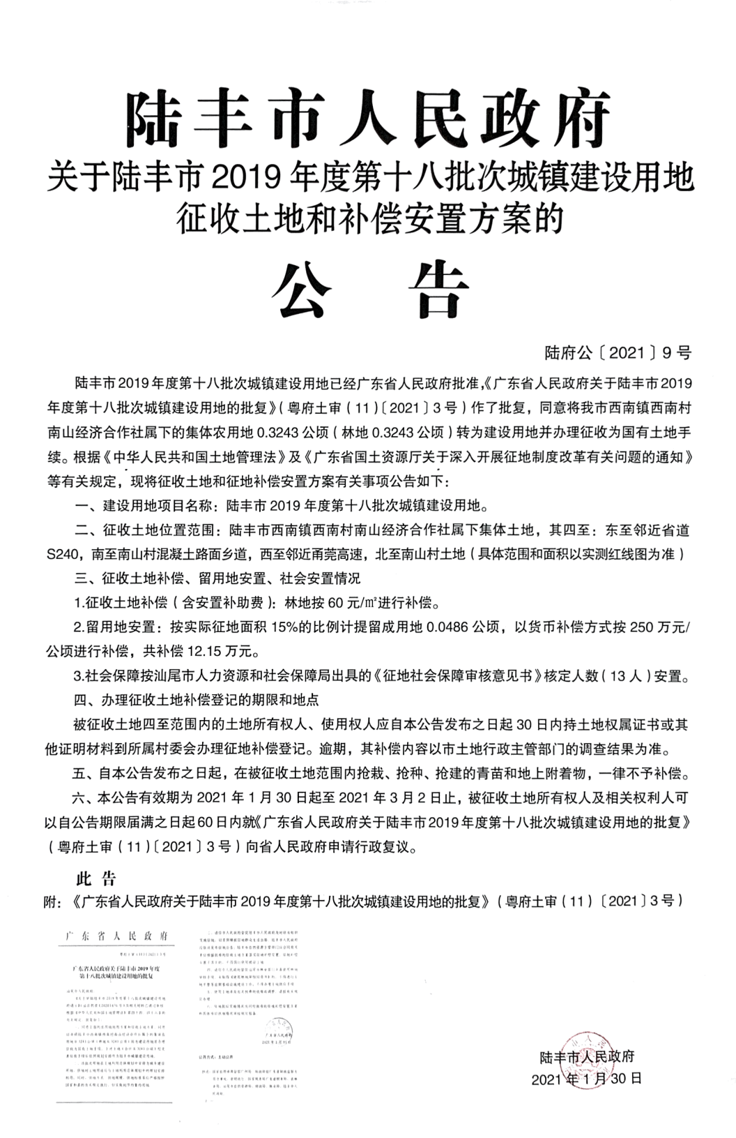 廣東省人民政府關(guān)于陸豐市2019年度第十八批次城鎮(zhèn)建設(shè)用地的批復(fù)(粵府土審(11)〔2021〕3號(hào))