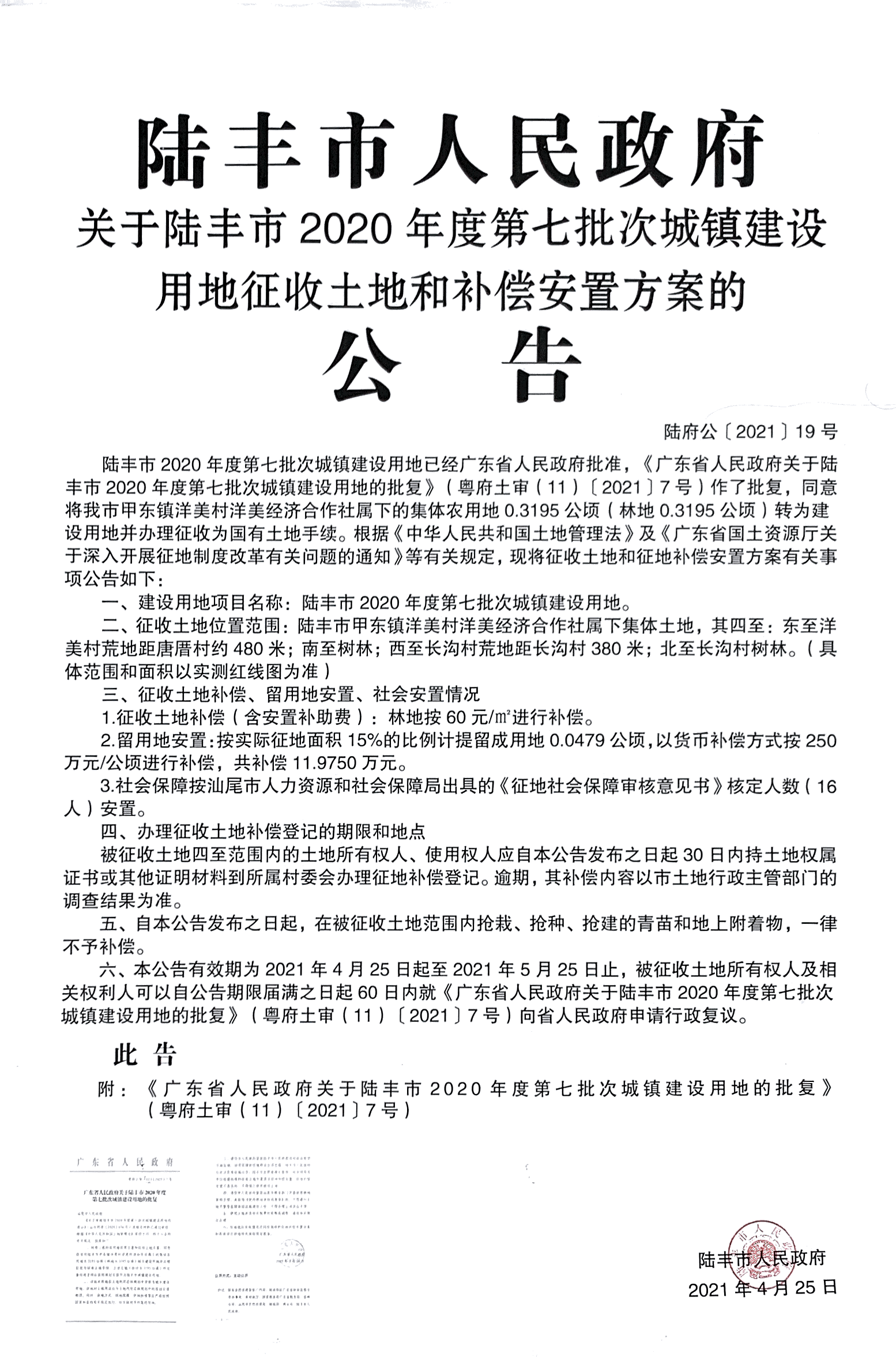 廣東省人民政府關(guān)于陸豐市2020年度第七批次城鎮(zhèn)建設(shè)用地的批復(fù)(粵府土審(11)〔2021〕7號(hào))