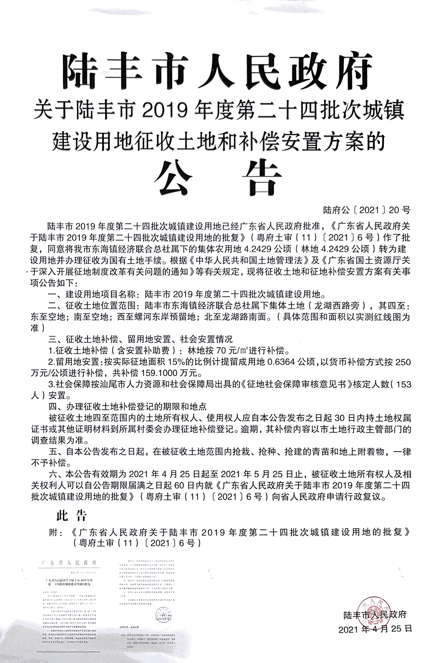 廣東省人民政府關(guān)于陸豐市2019年度第二十四批次城鎮(zhèn)建設(shè)用地的批復(fù)(粵府土審(11)〔2021〕6號(hào))