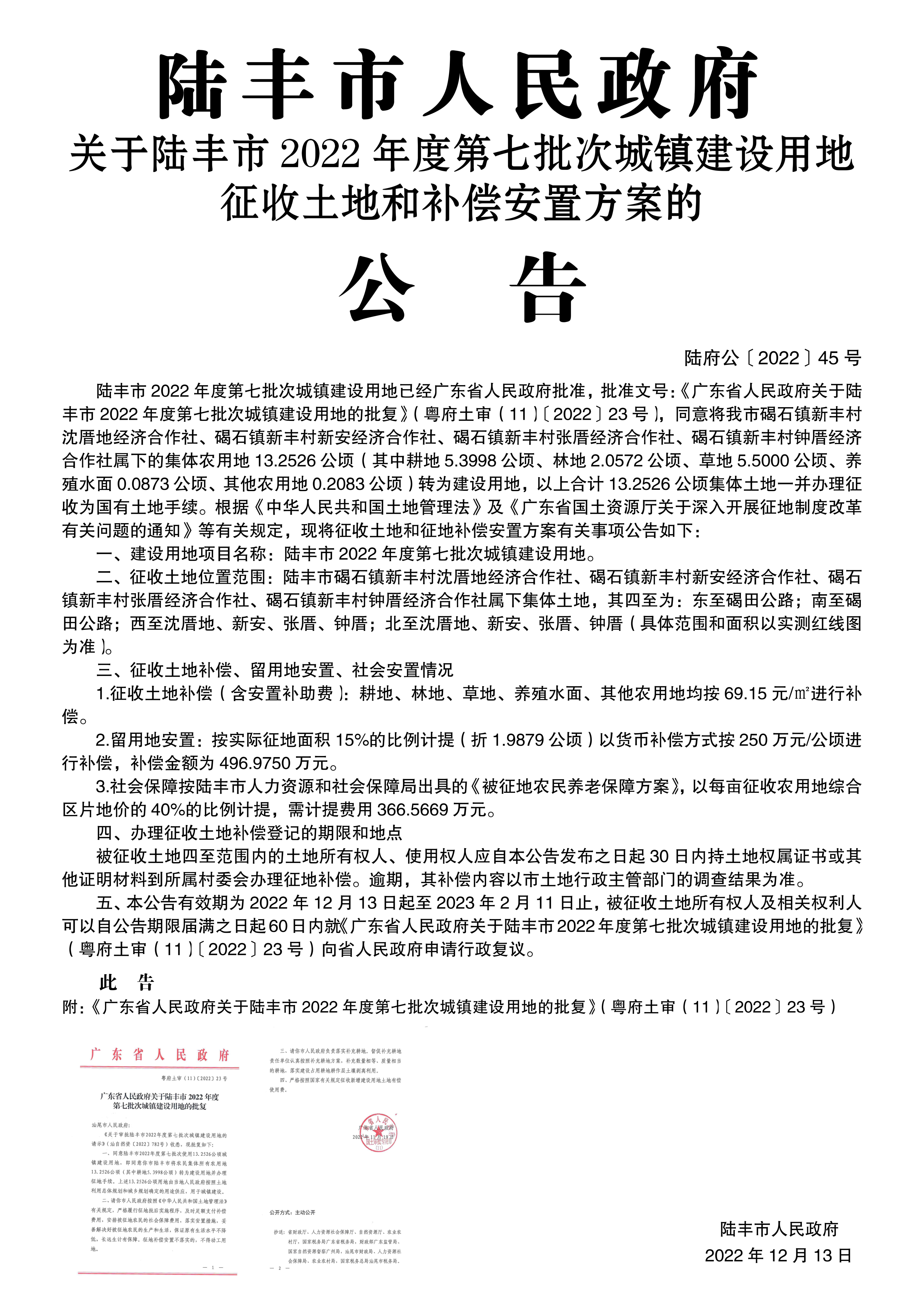 廣東省人民政府關于陸豐市2022年度第七批次城鎮(zhèn)建設用地的批復(粵府土審(11)〔2022〕23號)