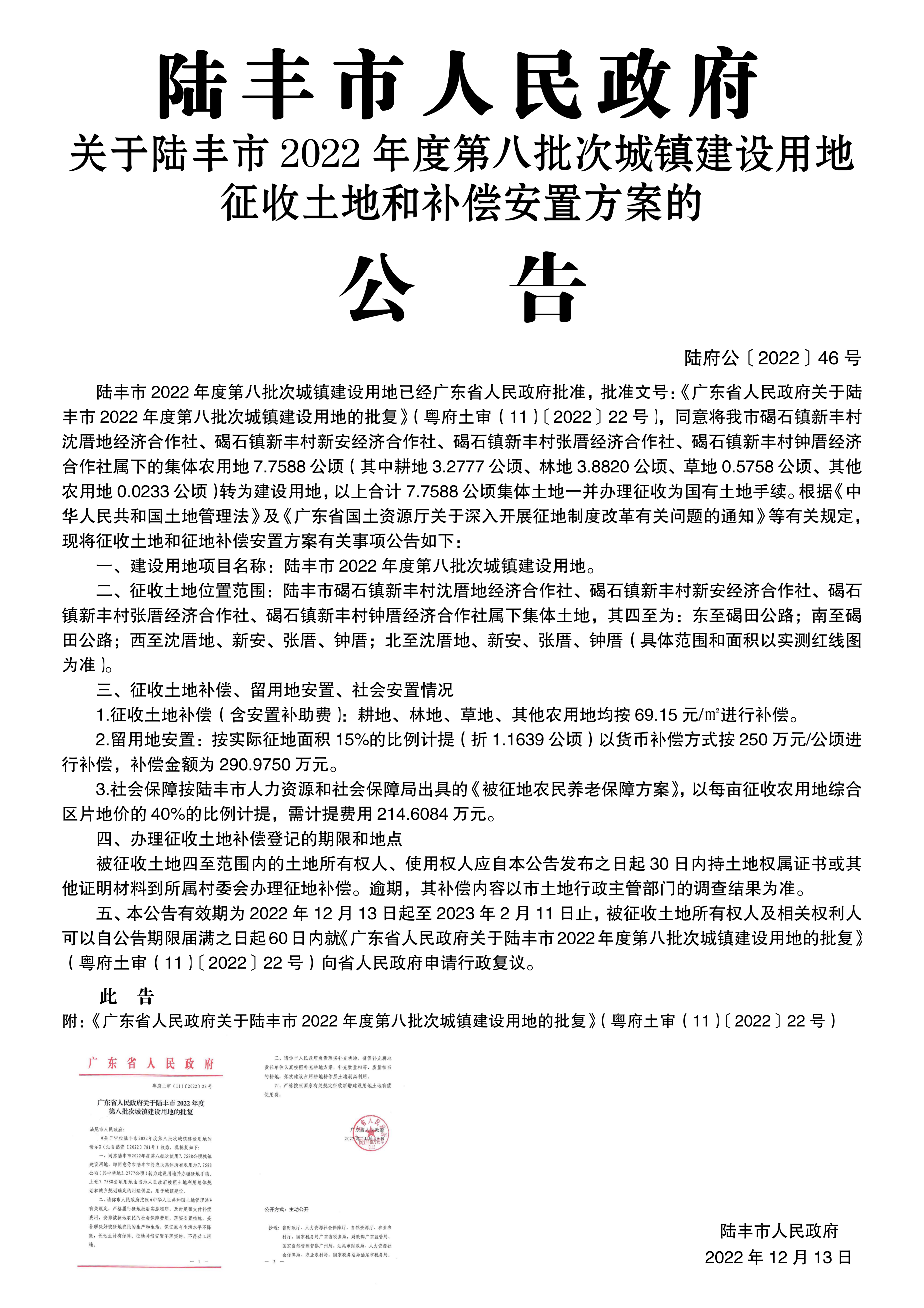 廣東省人民政府關于陸豐市 2022年度第八批次城鎮(zhèn)建設用地的批復(粵府土審(11)〔2022〕22號)