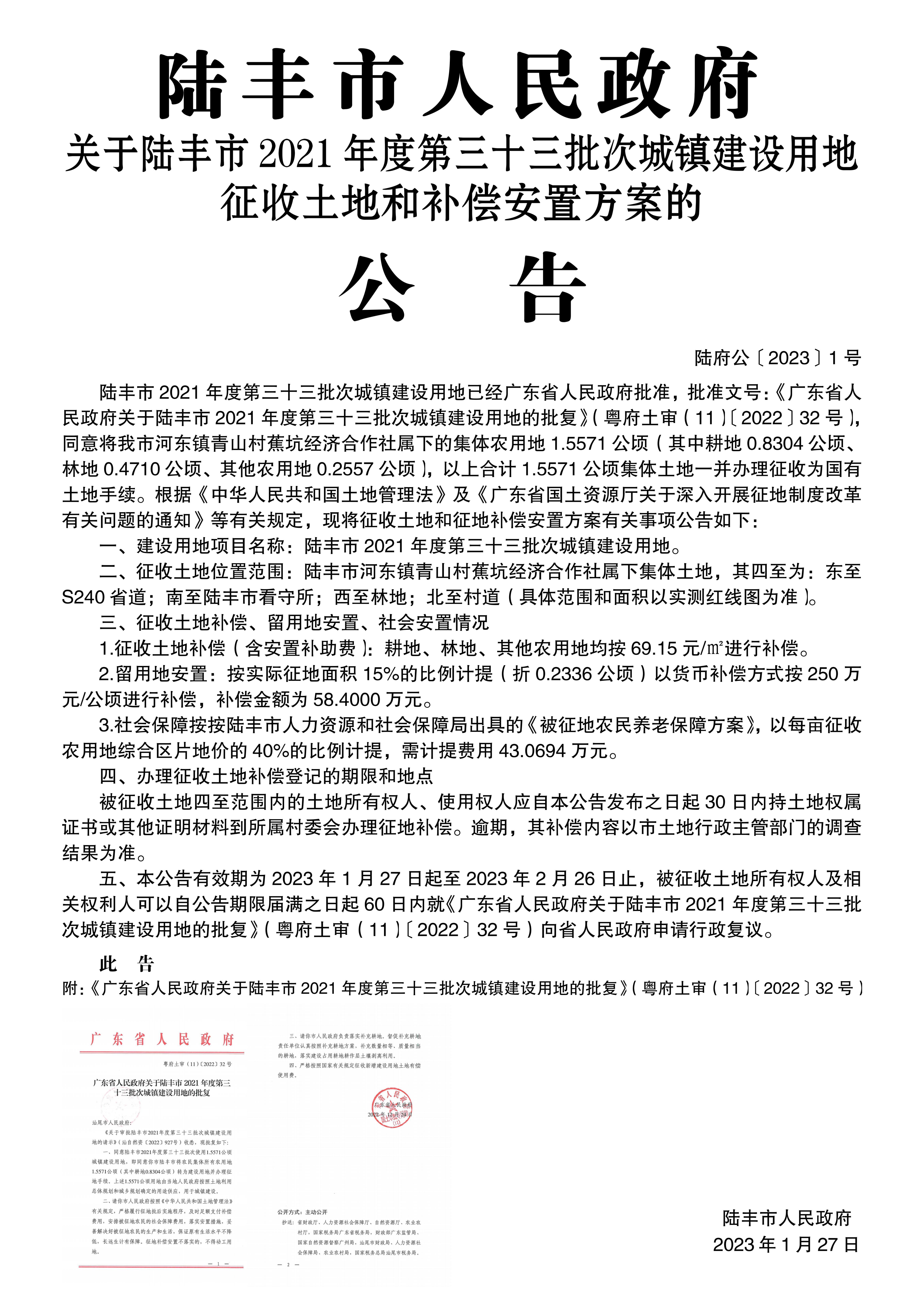 廣東省人民政府關(guān)于陸豐市2021年度第三十三批次城鎮(zhèn)建設(shè)用地的批復(fù)(粵府土審(11)〔2022〕32號(hào))