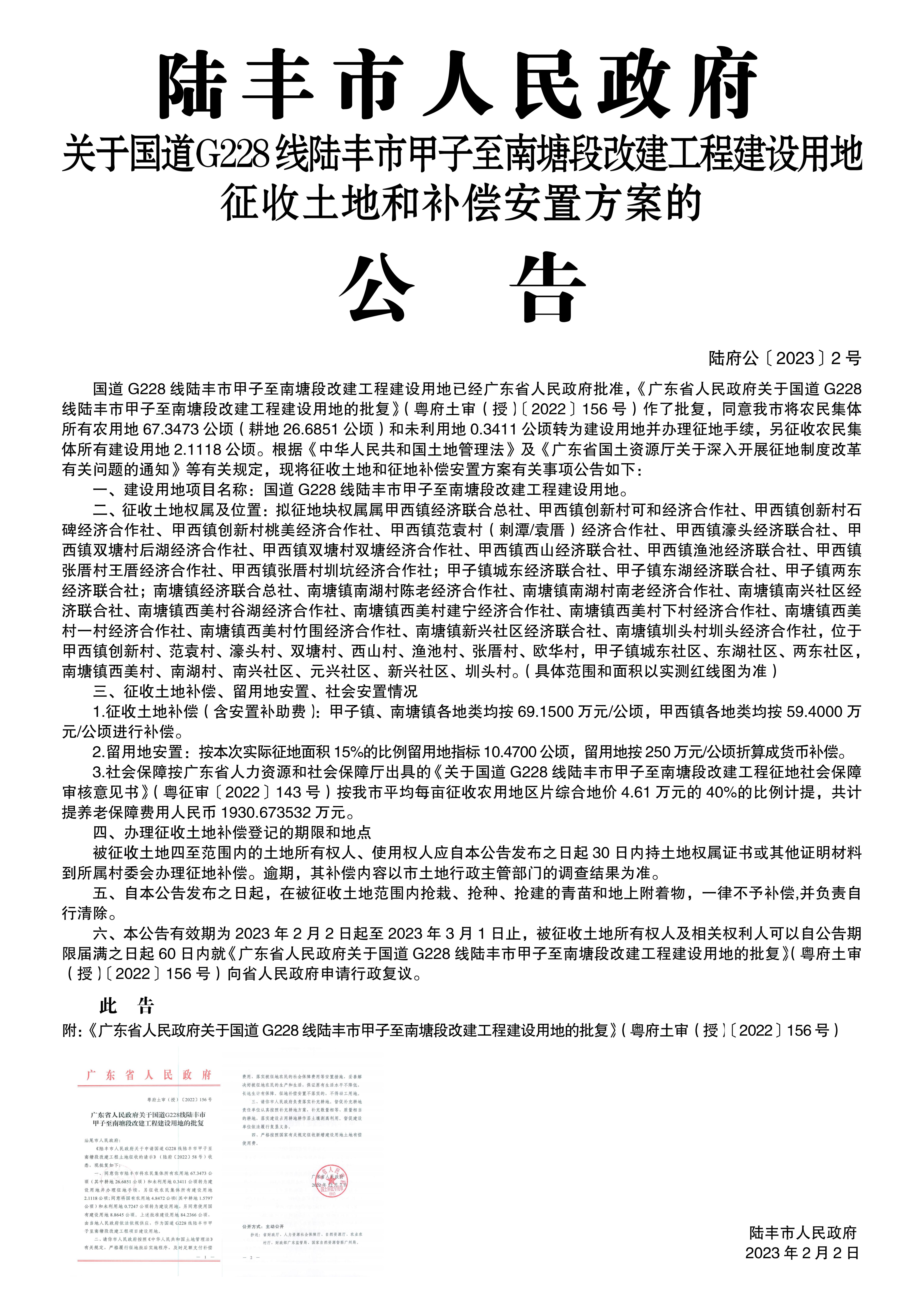 廣東省人民政府關于國道G228線陸豐市甲子至南塘段改建工程建設用地的批復(粵府土審(授)〔2022〕156號)