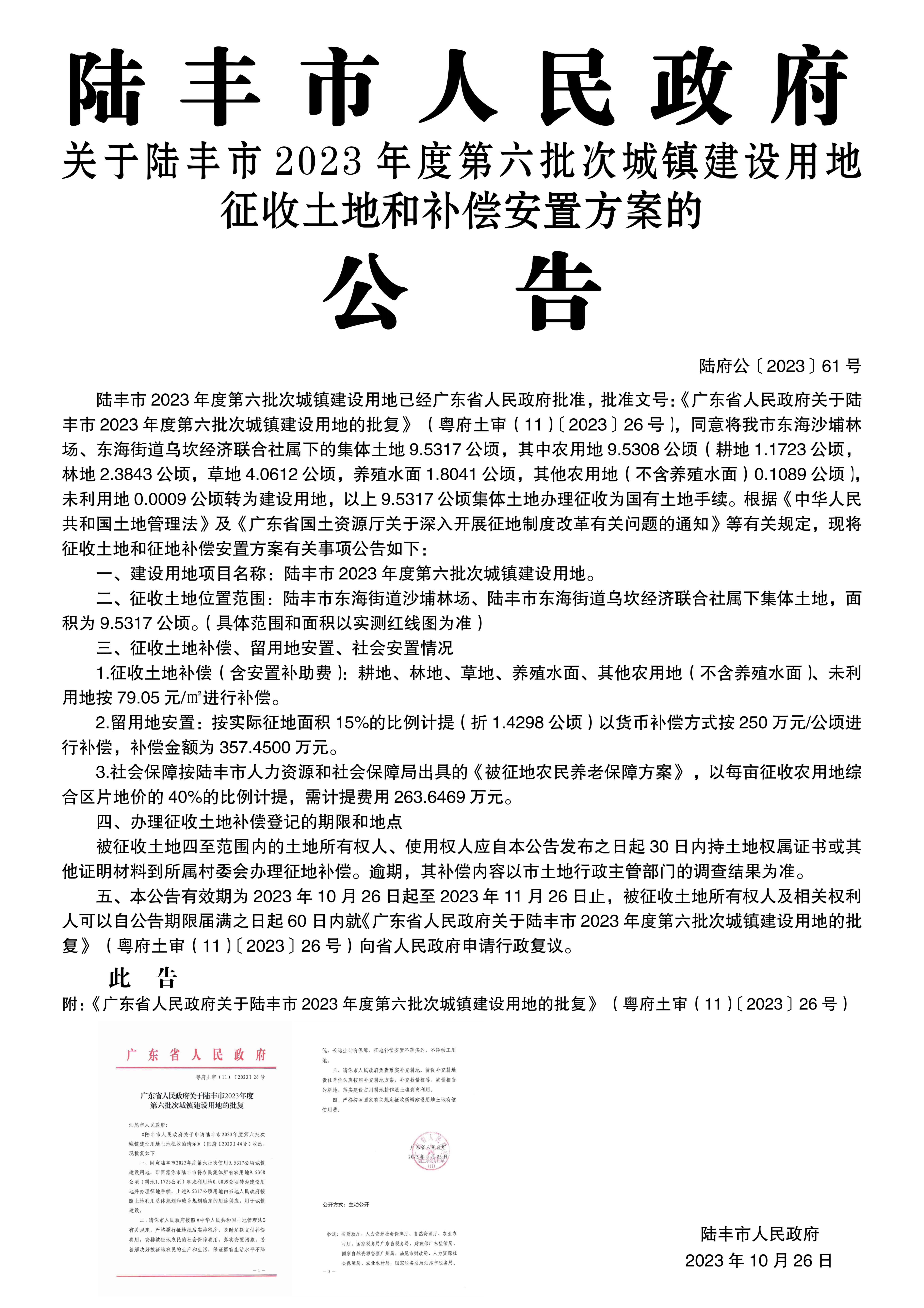 廣東省人民政府關(guān)于陸豐市 2023年度第六批次城鎮(zhèn)建設(shè)用地的批復(fù)(粵府土審(11)〔2023〕26號(hào))