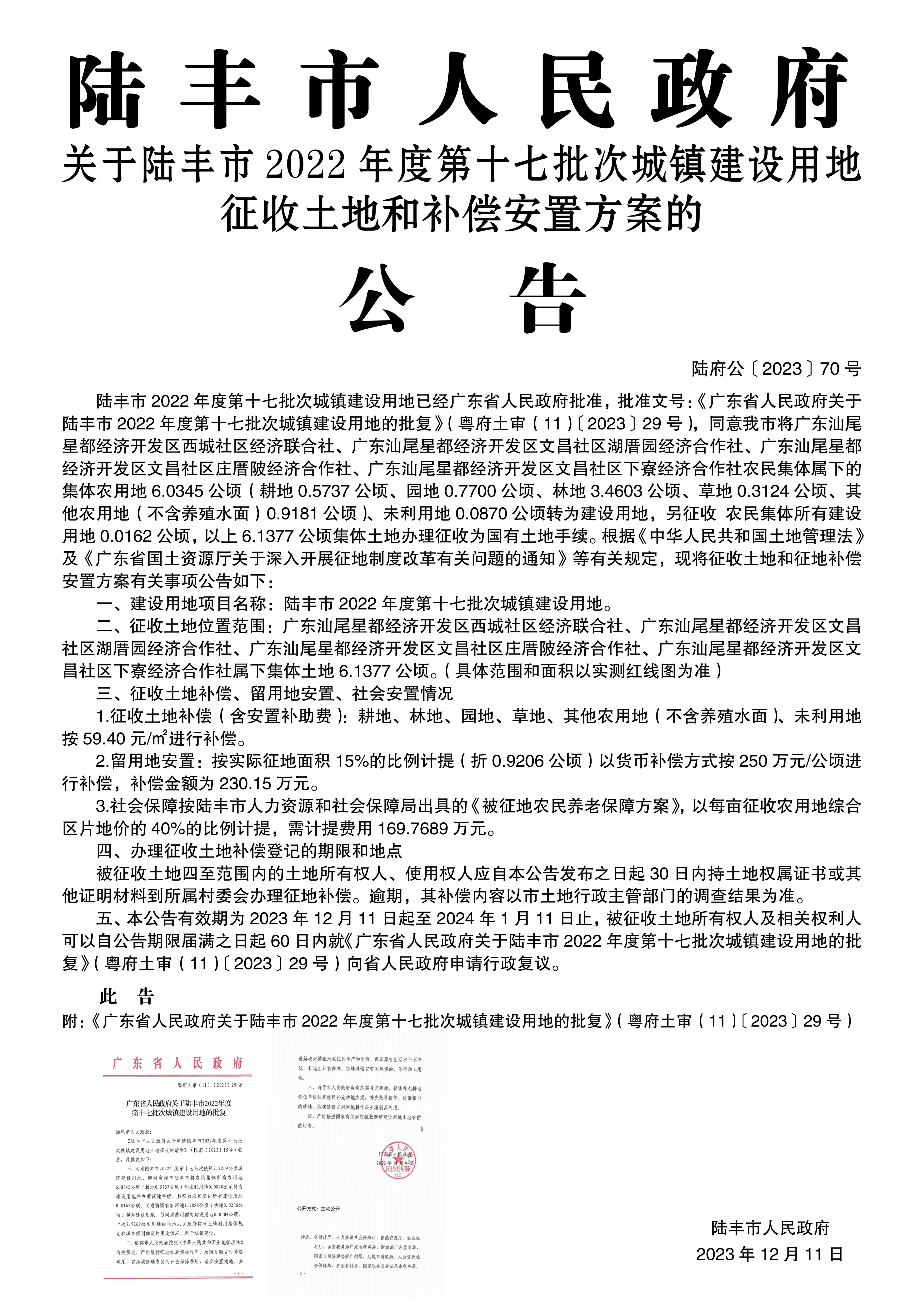 廣東省人民政府關于陸豐市 2022年度第十七批次城鎮(zhèn)建設用地的批復(粵府土審(11)〔2023〕29號)