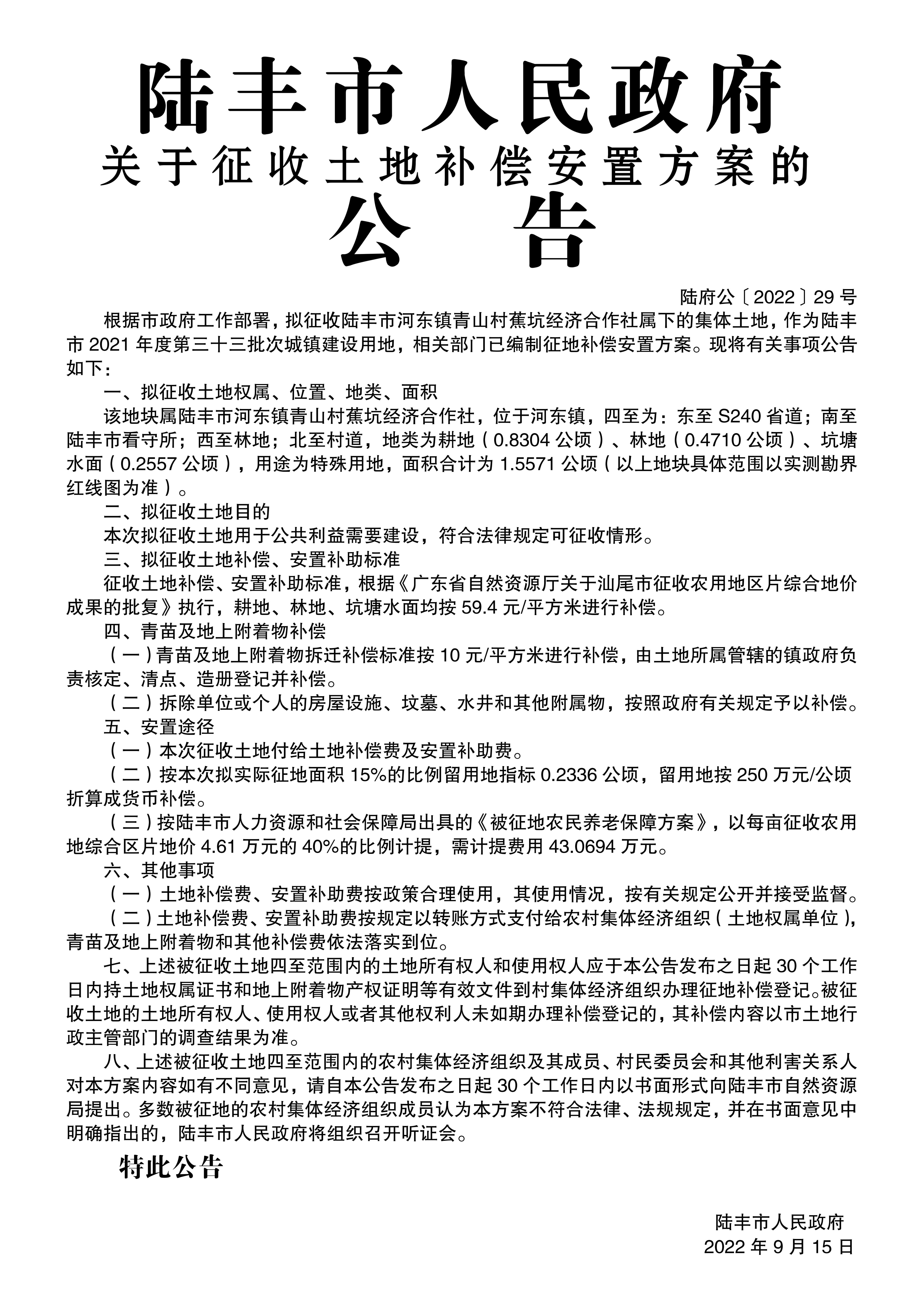 陸豐市人民政府關(guān)于征收土地補(bǔ)償安置方案的公告(陸府公[2022]29號)