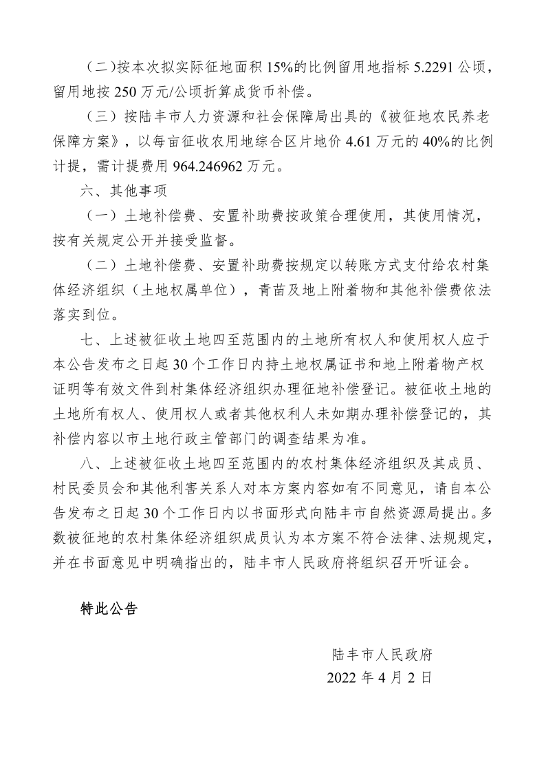 陸豐市人民政府關(guān)于征收土地補償安置方案的公告(陸府公〔2022〕8 號)