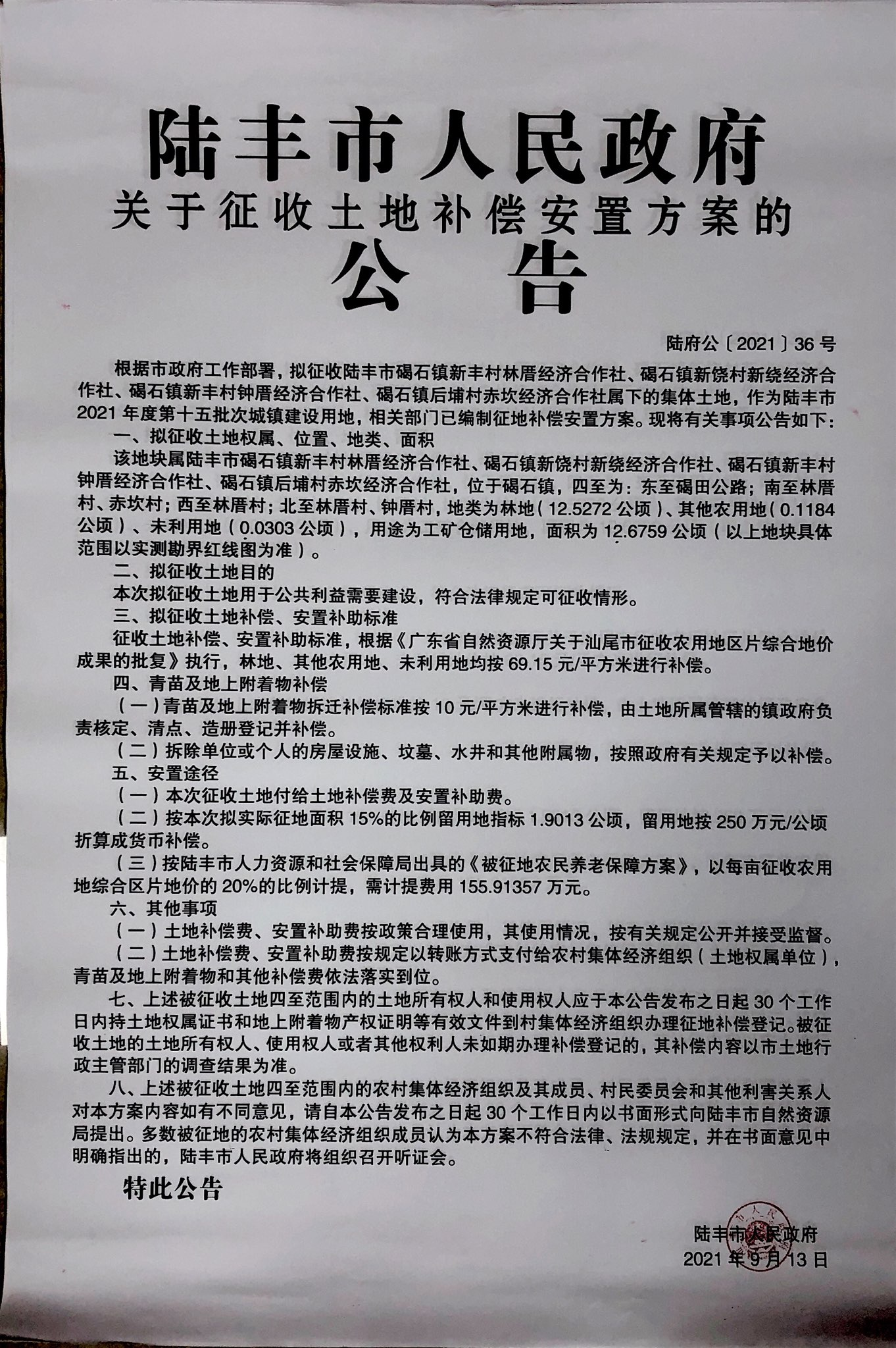 陸豐市人民政府關(guān)于征收土地補(bǔ)償安置方案的公告(陸府公[2021]36號)
