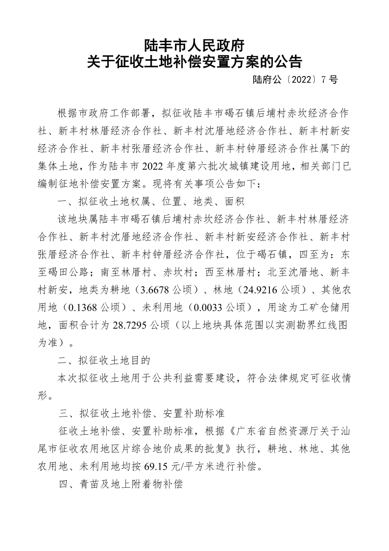 陸豐市人民政府關(guān)于征收土地補(bǔ)償安置方案的公告(陸府公〔2022〕7 號)