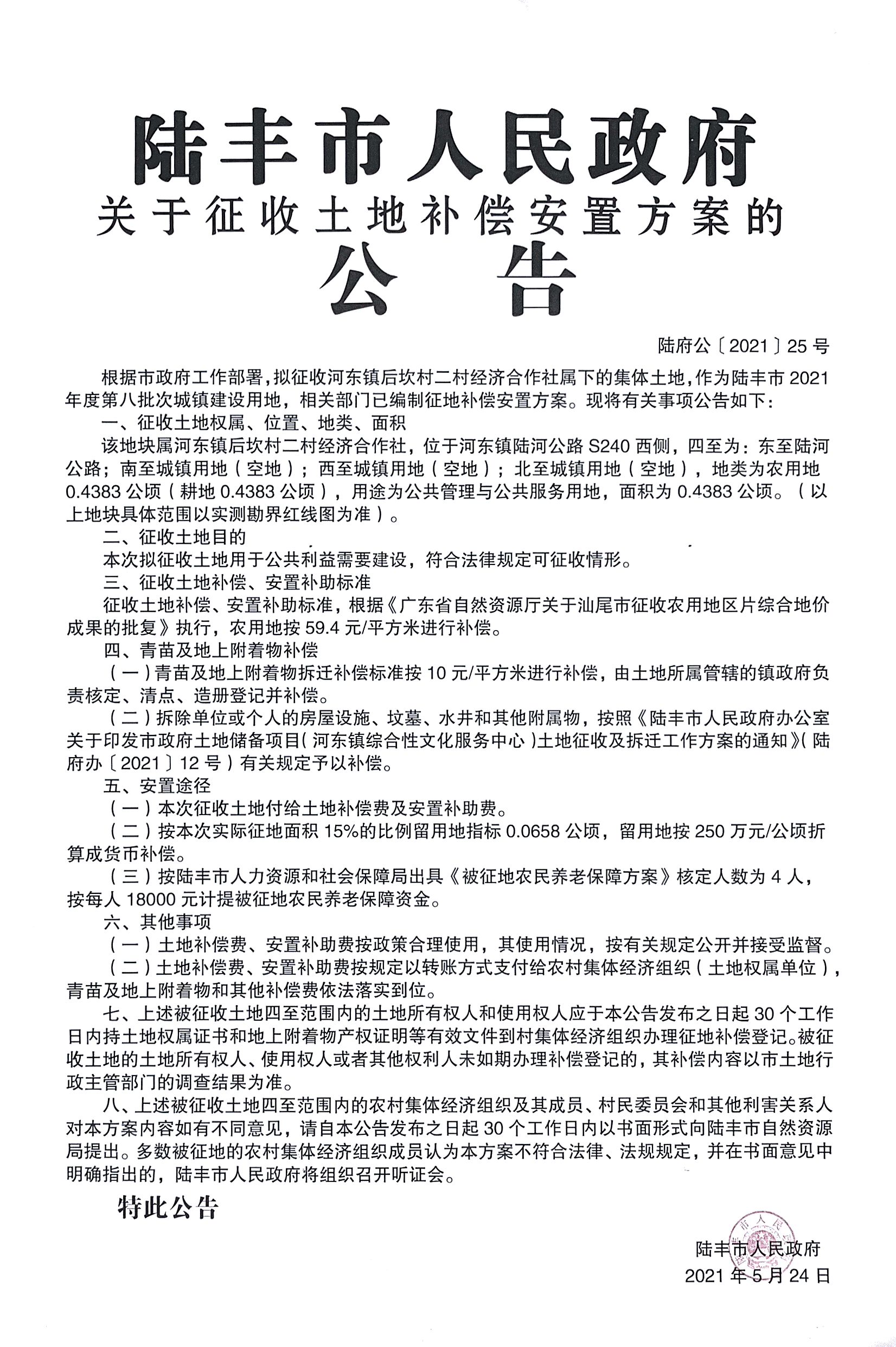 陸豐市人民政府關于征收土地補償安置方案的公告(陸府公〔2021〕25號)