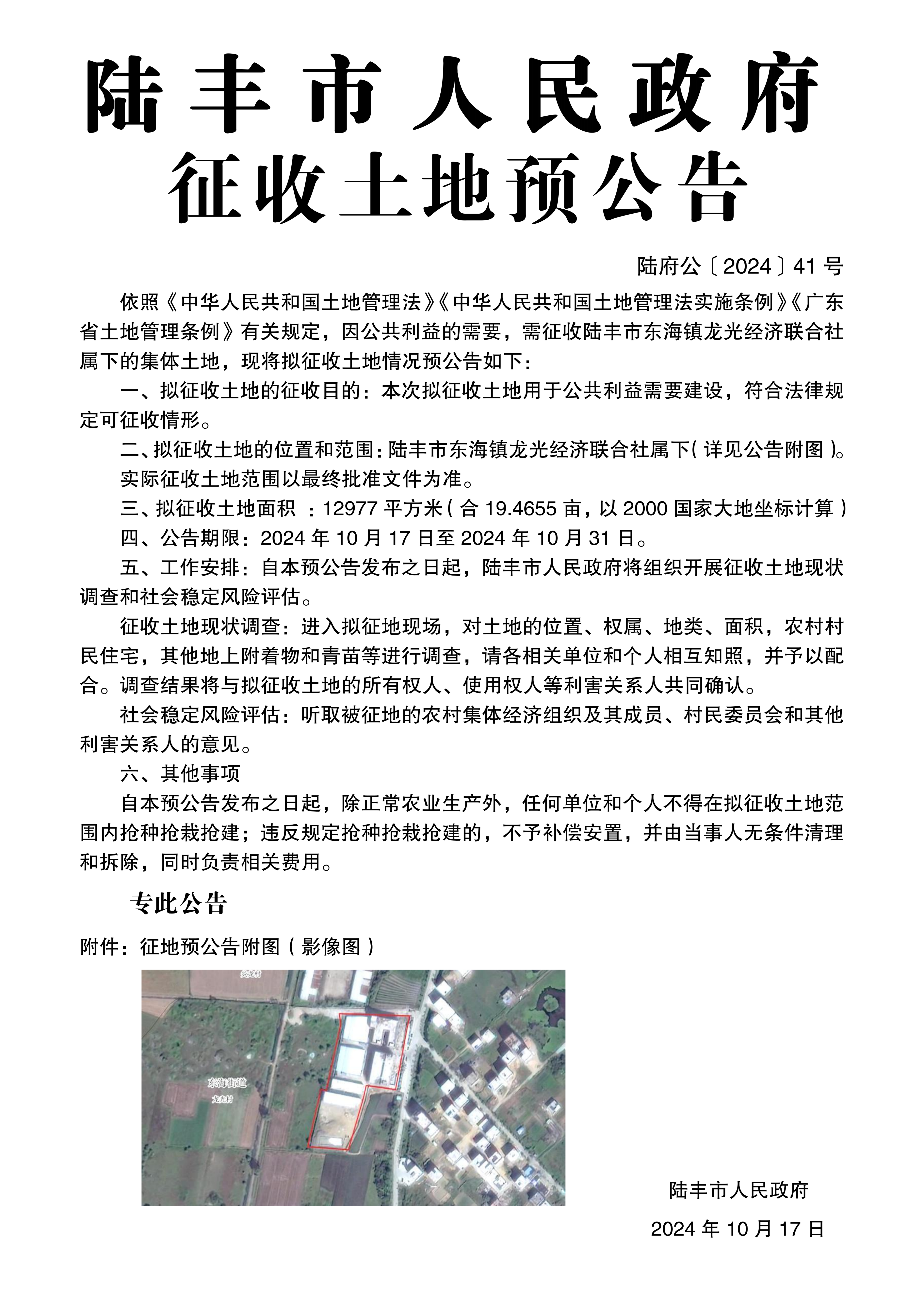 陸豐市人民政府征收土地預(yù)公告(陸府公〔2024〕41號(hào))