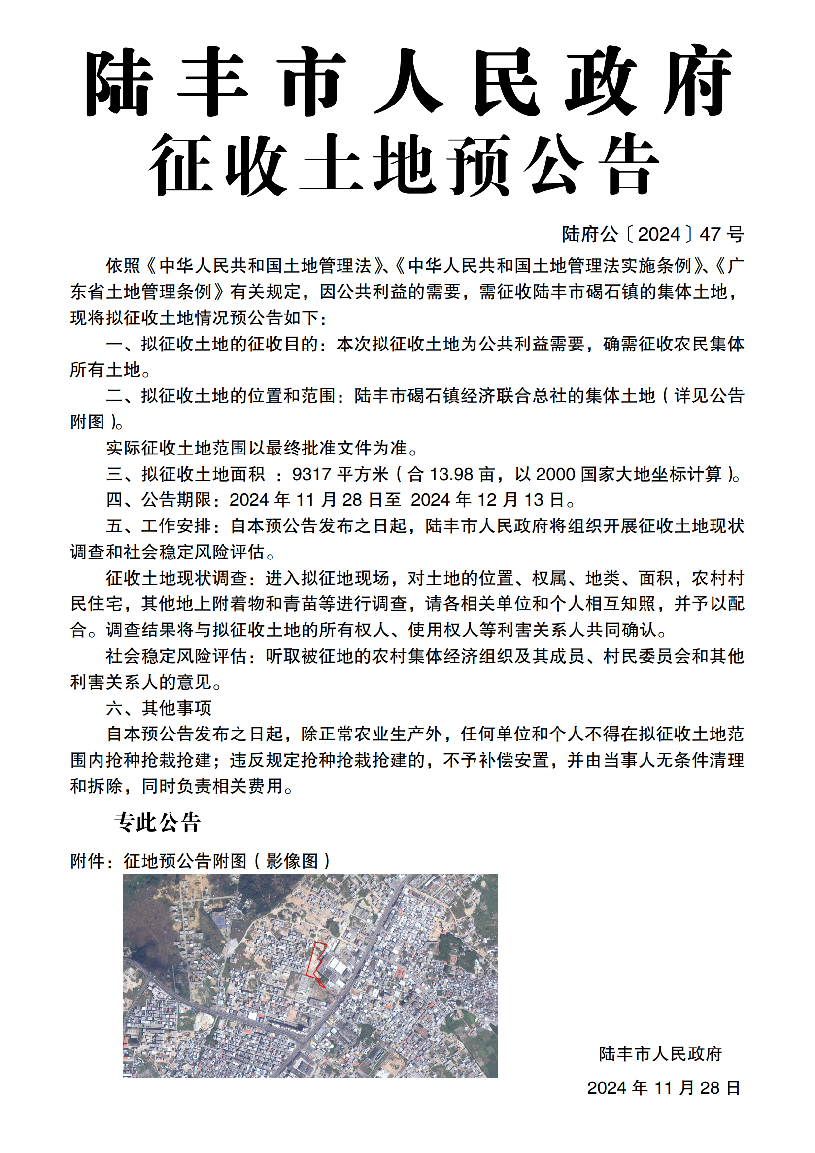 陸豐市人民政府關于征收土地預公告(陸府公〔2024〕47號)