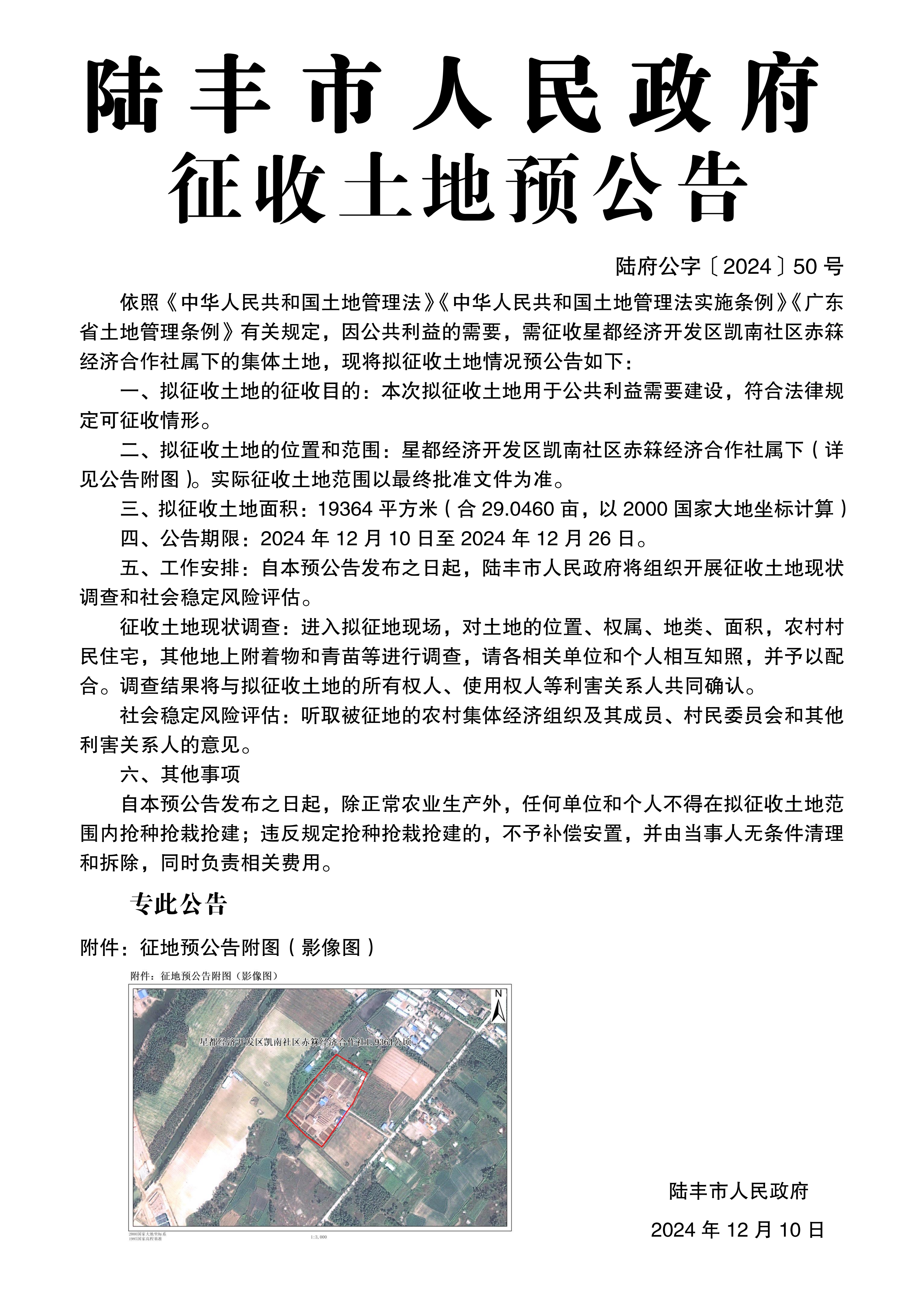 陸豐市人民政府征收土地預(yù)公告(陸府公〔2024〕50號)