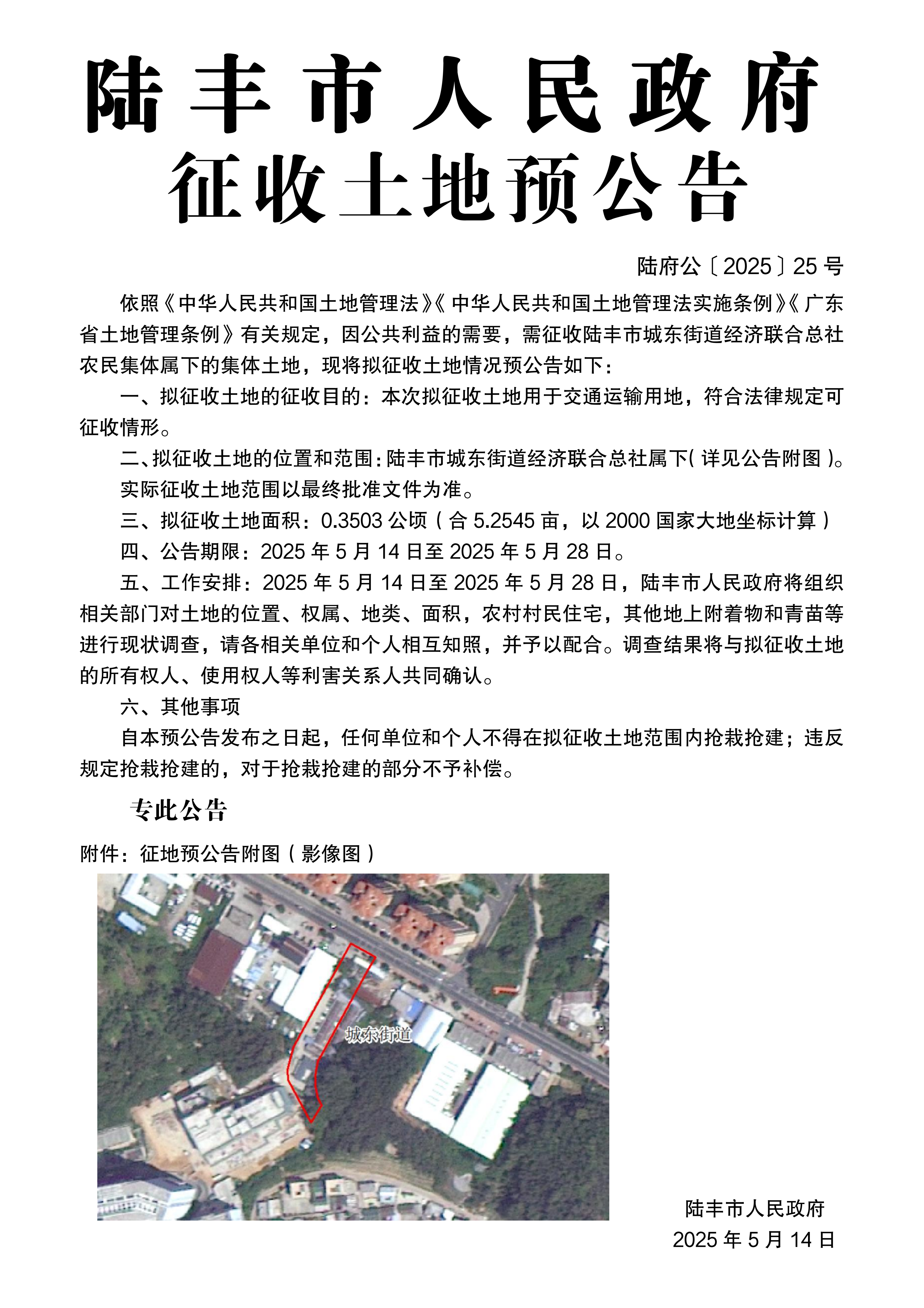 陸豐市人民政府關(guān)于征收土地預(yù)公告(陸府公〔2025〕25號(hào))
