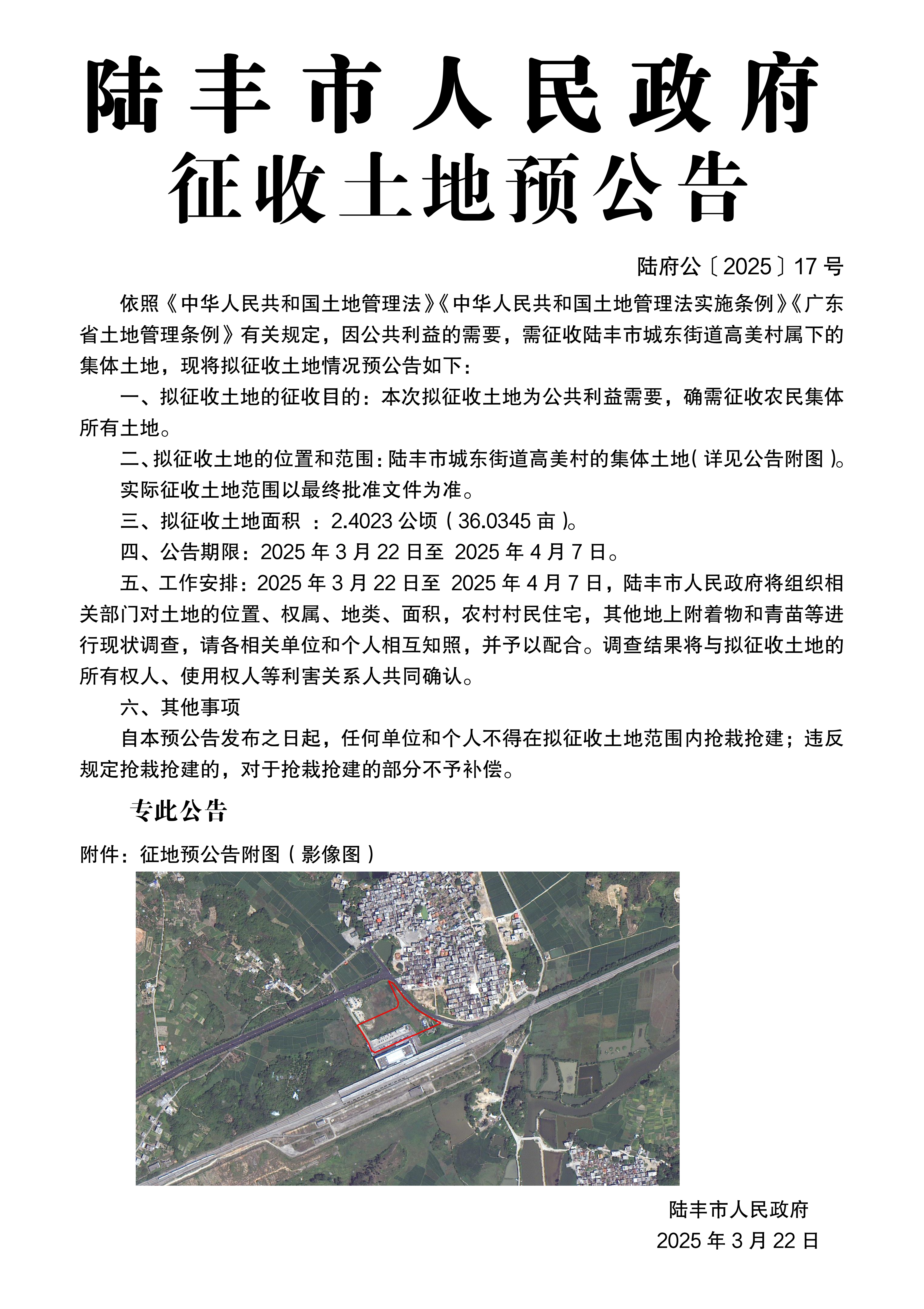 陸豐市人民政府關于征收土地預公告(陸府公〔2025〕17號)