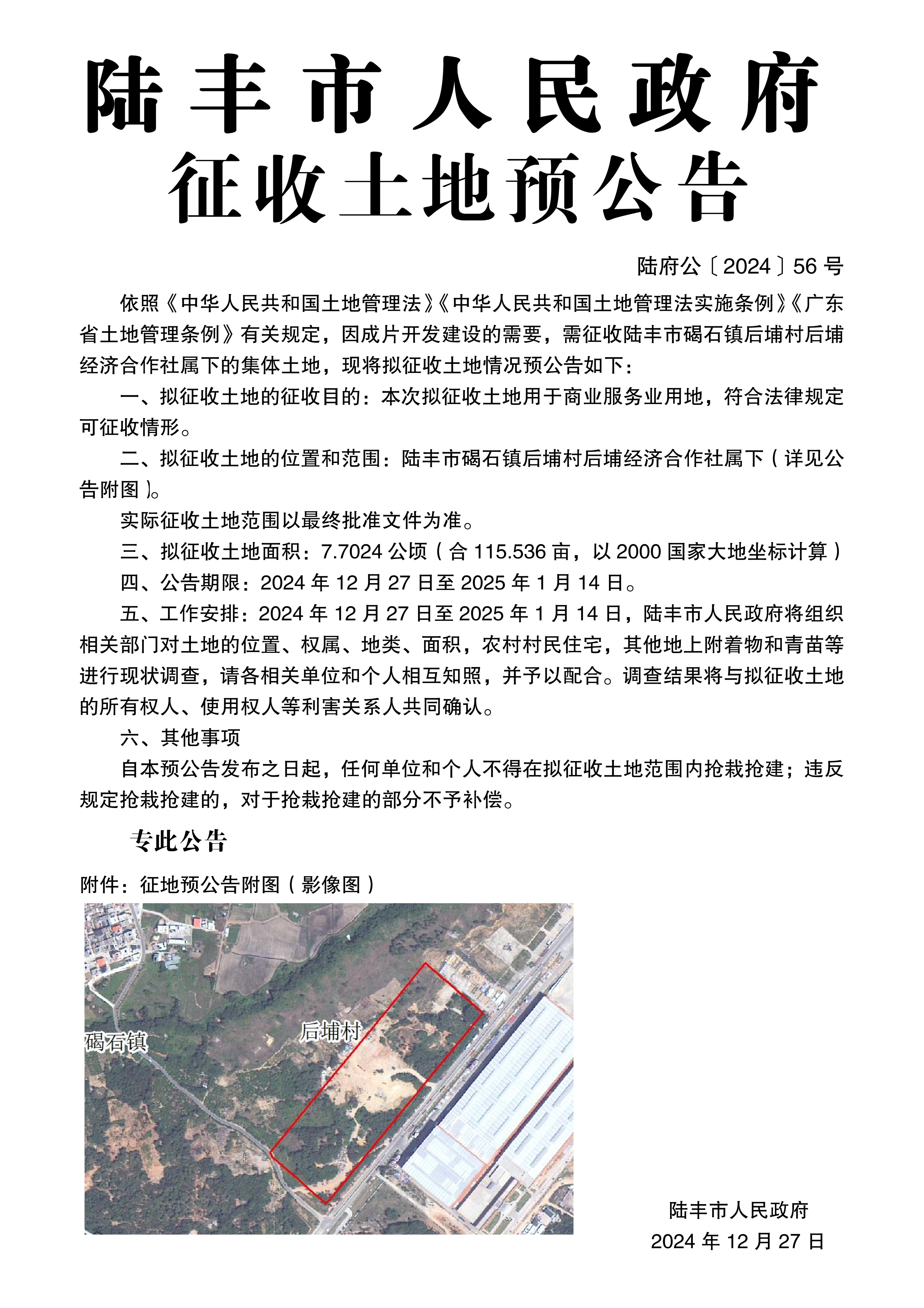 陸豐市人民政府征收土地預公告(陸府公〔2024〕56號)