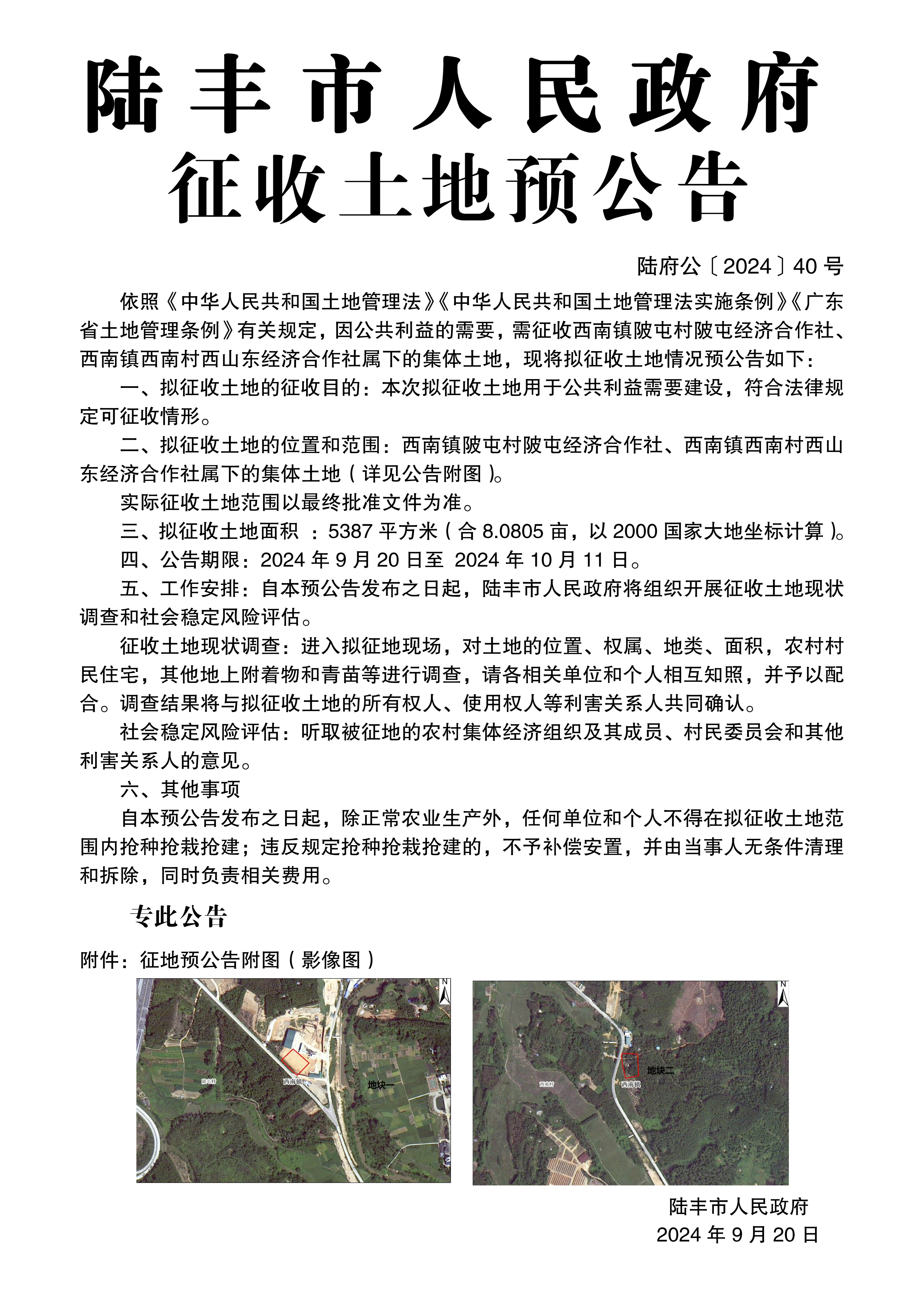 陸豐市人民政府關(guān)于征收土地預(yù)公告(陸府公〔2024〕40號(hào))