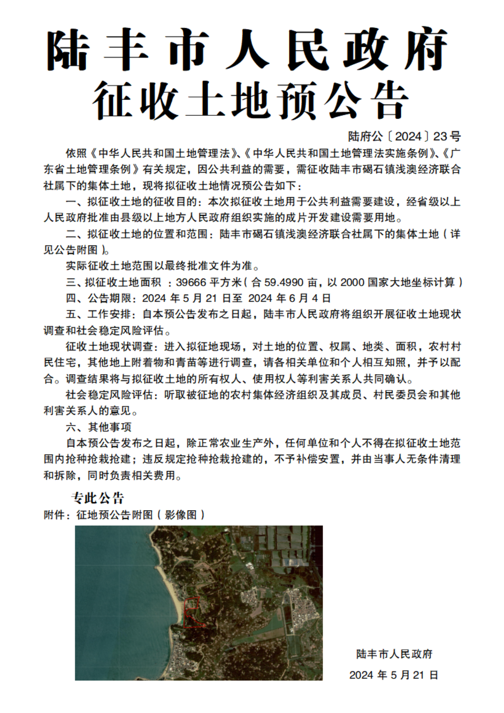 陸豐市人民政府征收土地預(yù)公告(陸府公〔2024〕23號(hào))