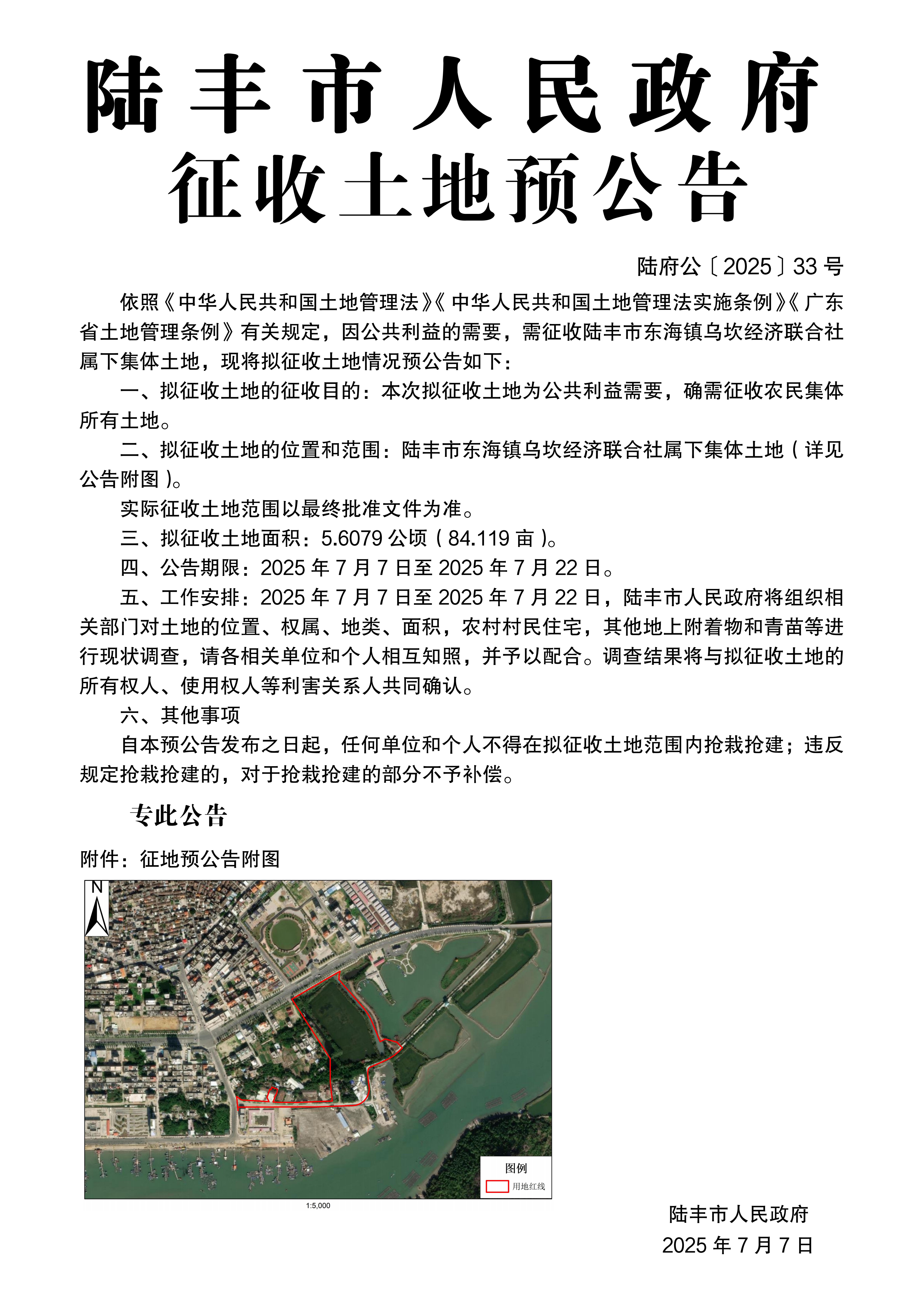 陸豐市人民政府關于征收土地預公告(陸府公〔2025〕33號)