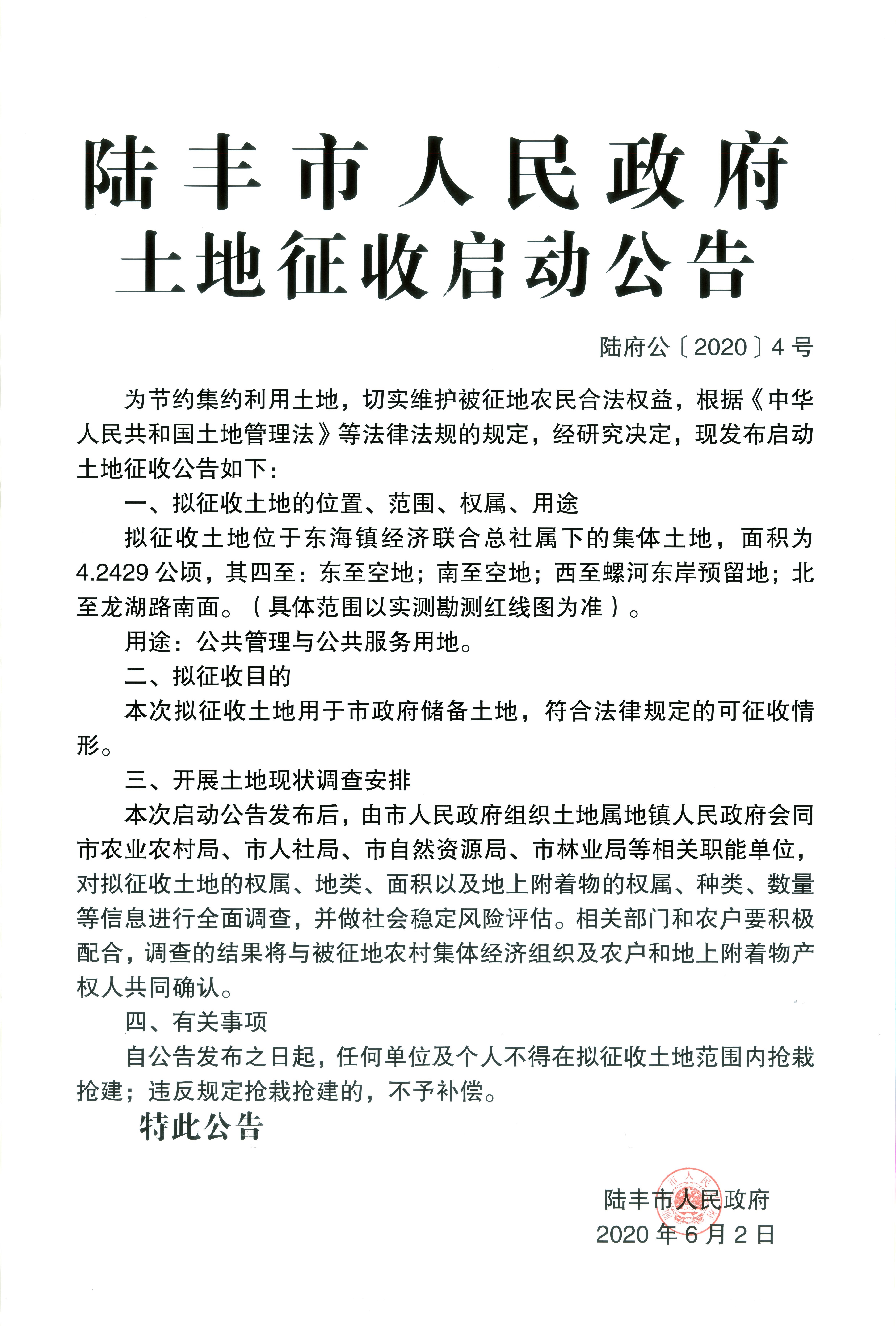 陸豐市人民政府土地征收啟動公告(陸府公(2020)4號)
