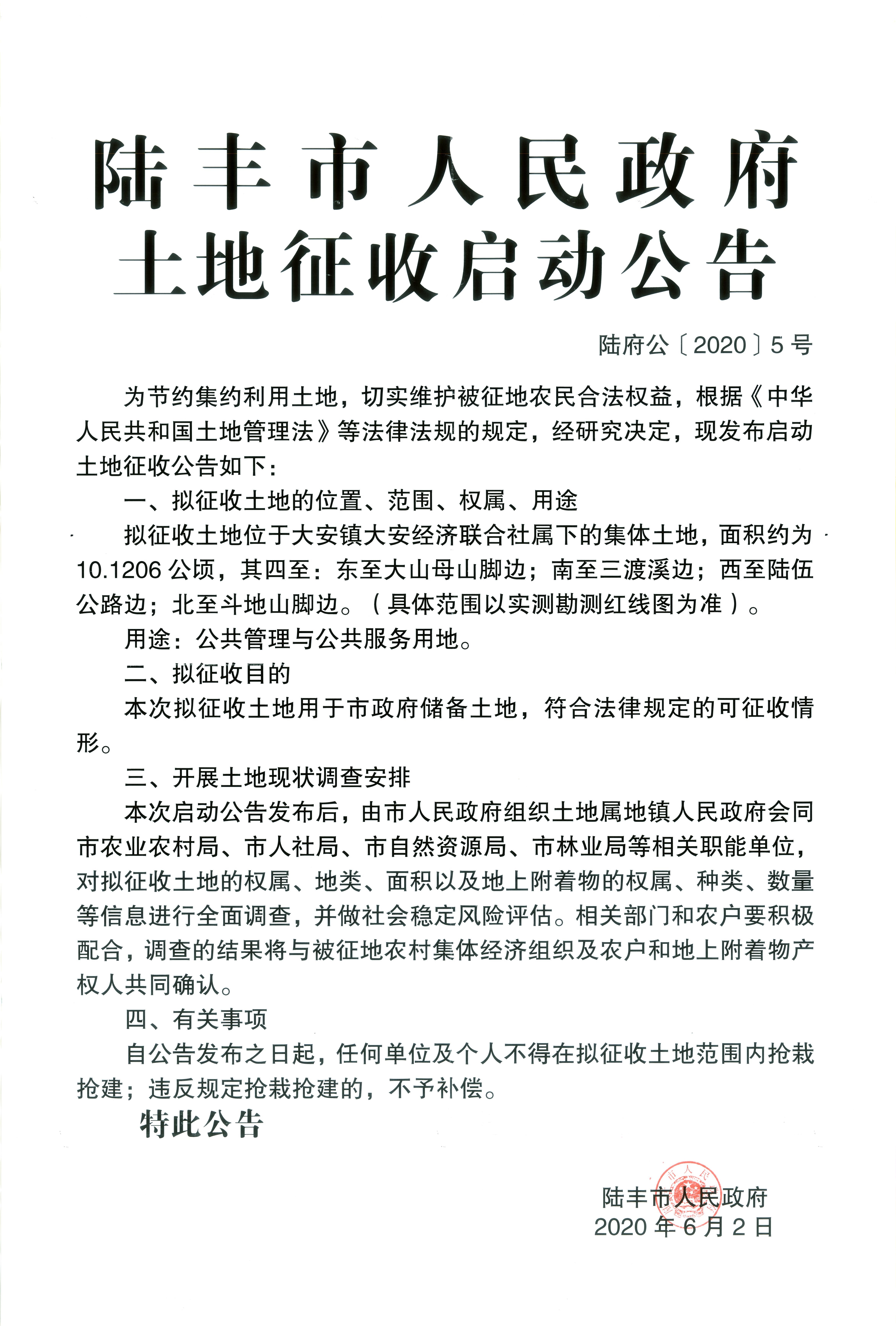 陸豐市人民政府土地征收啟動公告(陸府公(2020)5號)