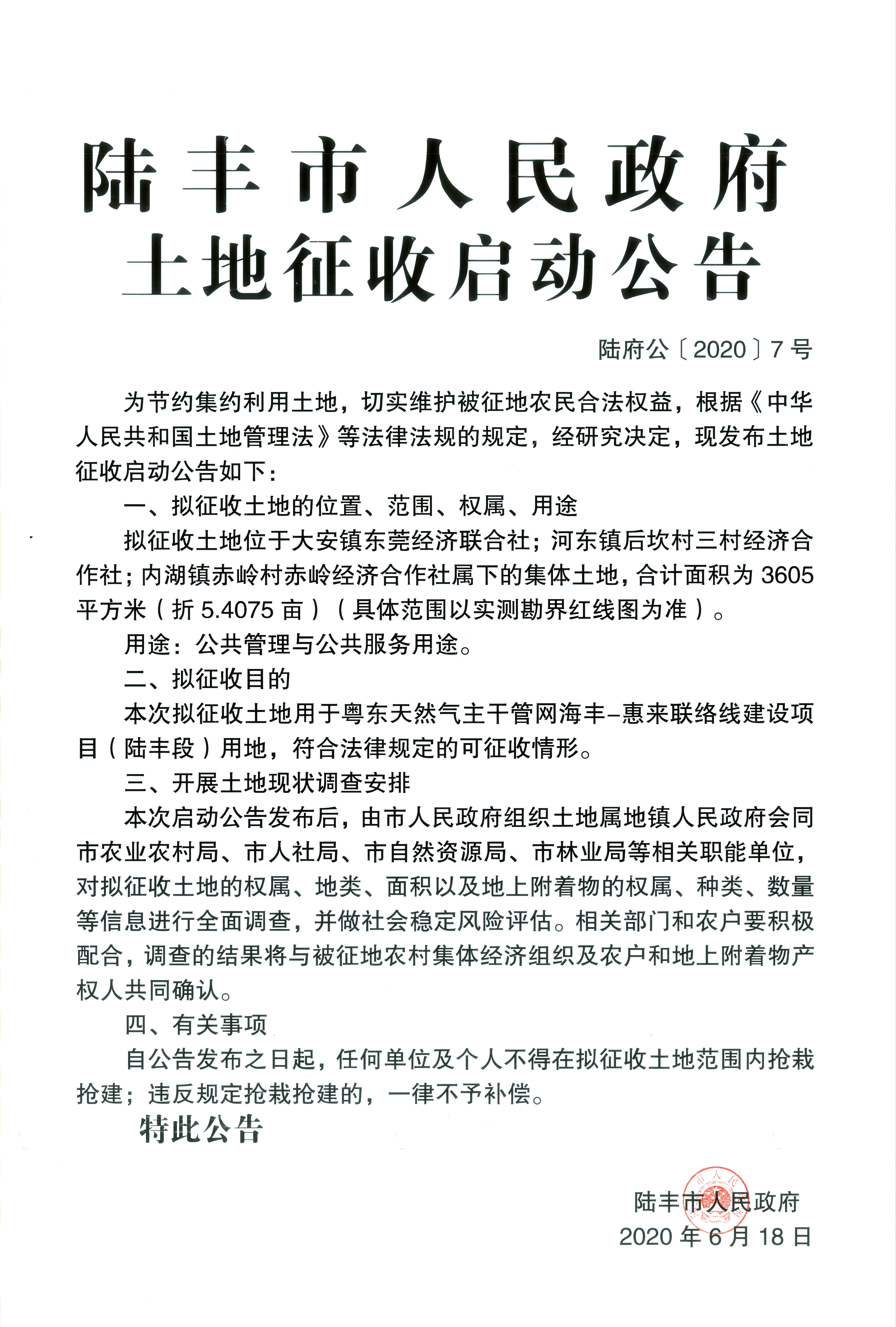 陸豐市人民政府土地征收啟動(dòng)公告(陸府公(2020)7號(hào))