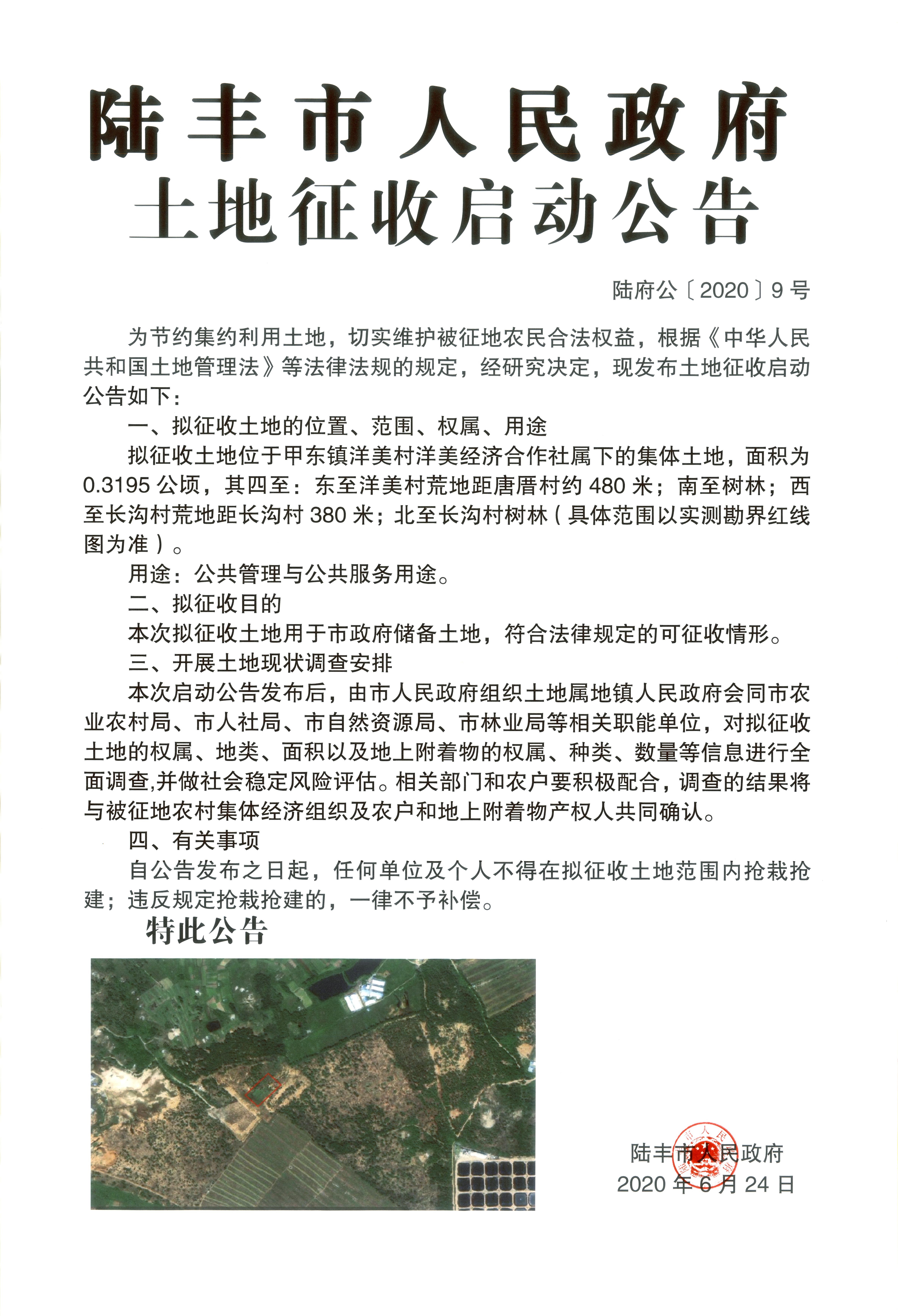 陸豐市人民政府土地征收啟動公告(陸府公(2020)9號)