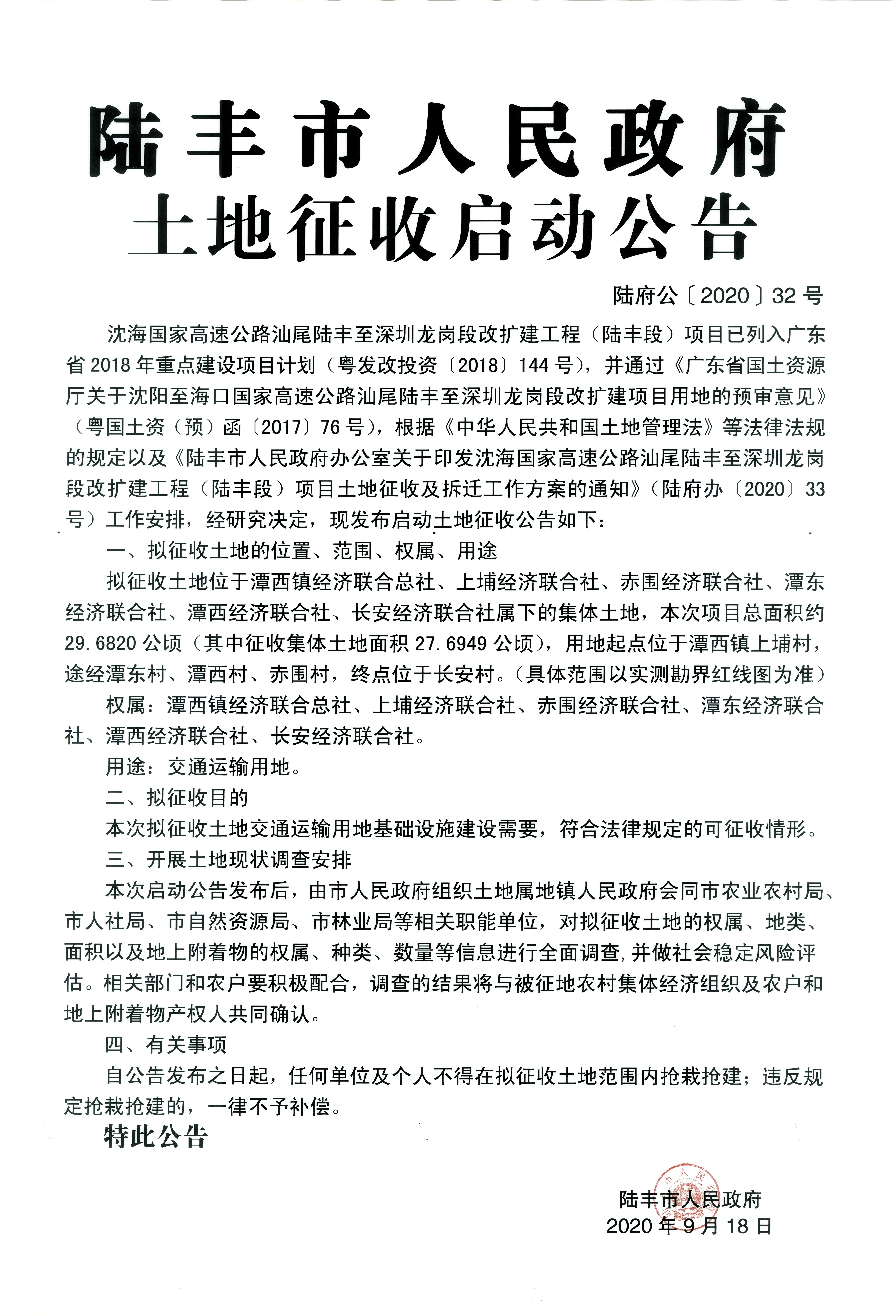 陸豐市人民政府土地征收啟動(dòng)公告-陸府公(2020)32號(hào)