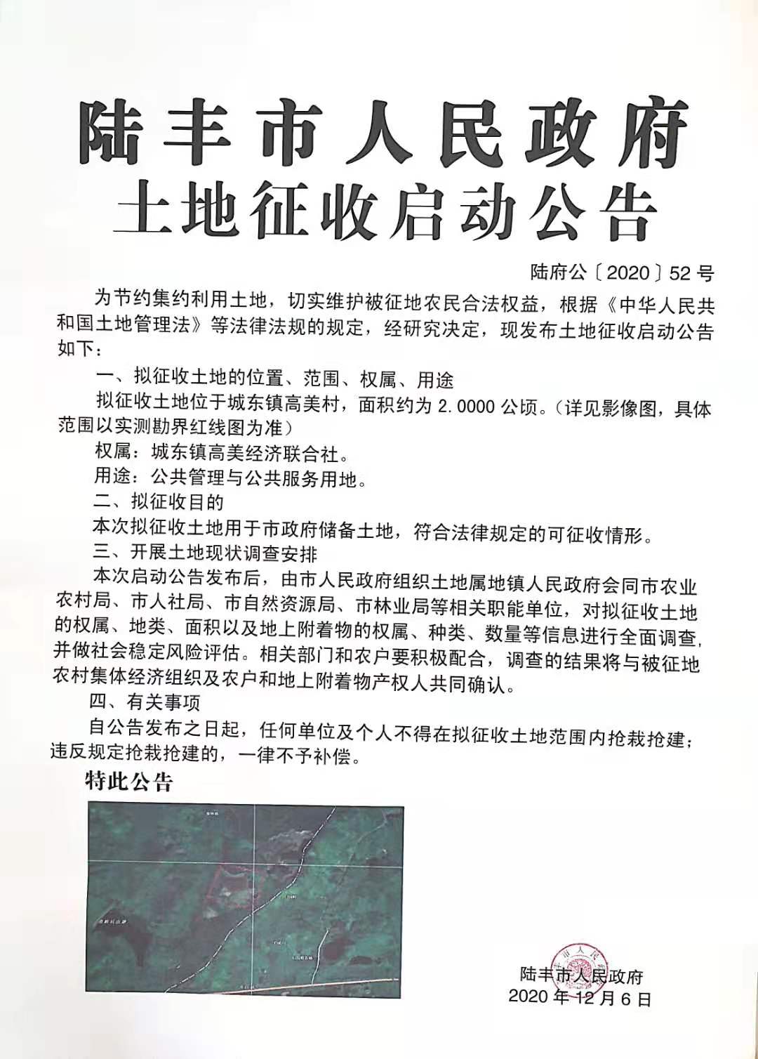 陸豐市人民政府土地征收啟動(dòng)公告(陸府公[2020]52號(hào))