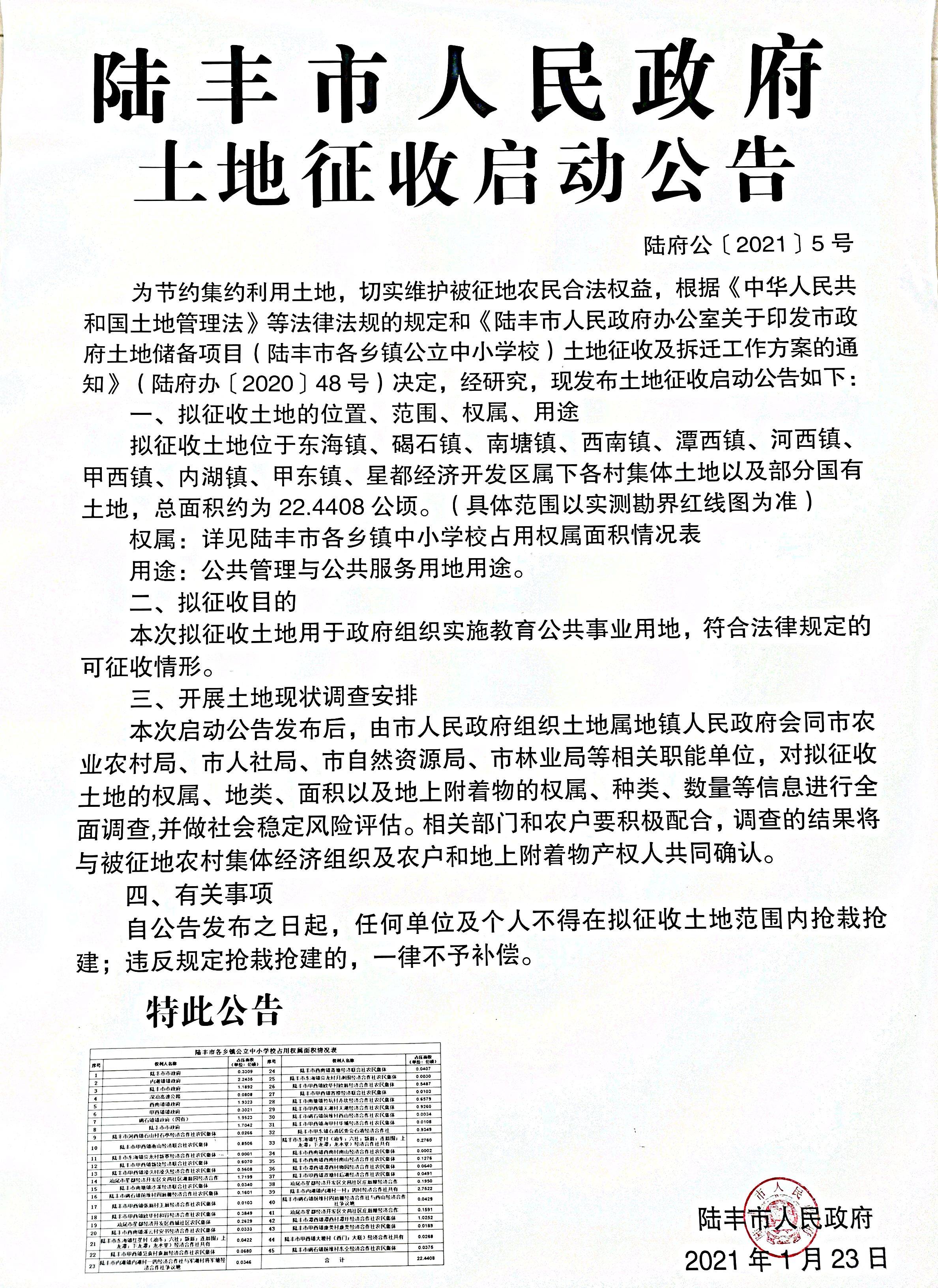 陸豐市人民政府土地征收啟動公告(陸府公[2021]5號)