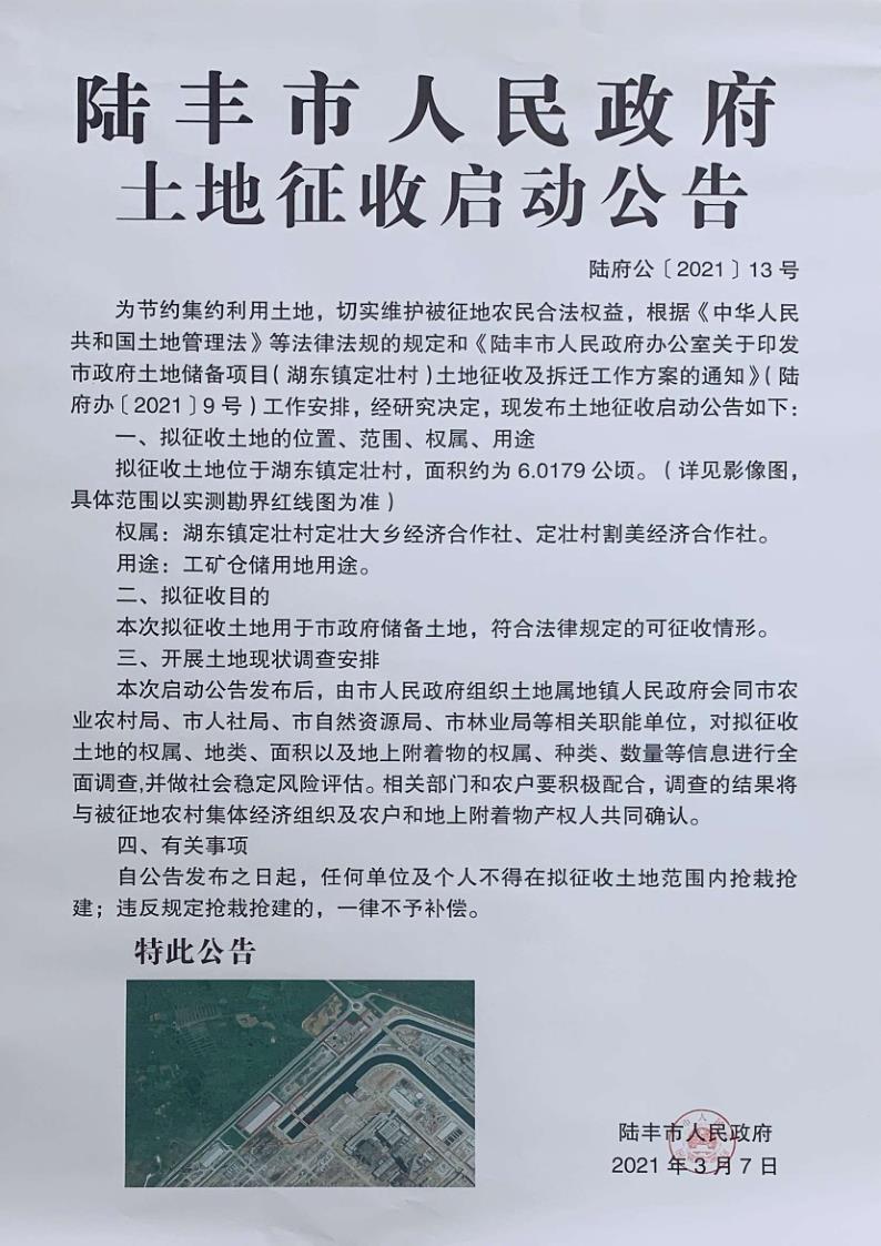 陸豐市人民政府土地征收啟動(dòng)公告(陸府公[2021]13號(hào))