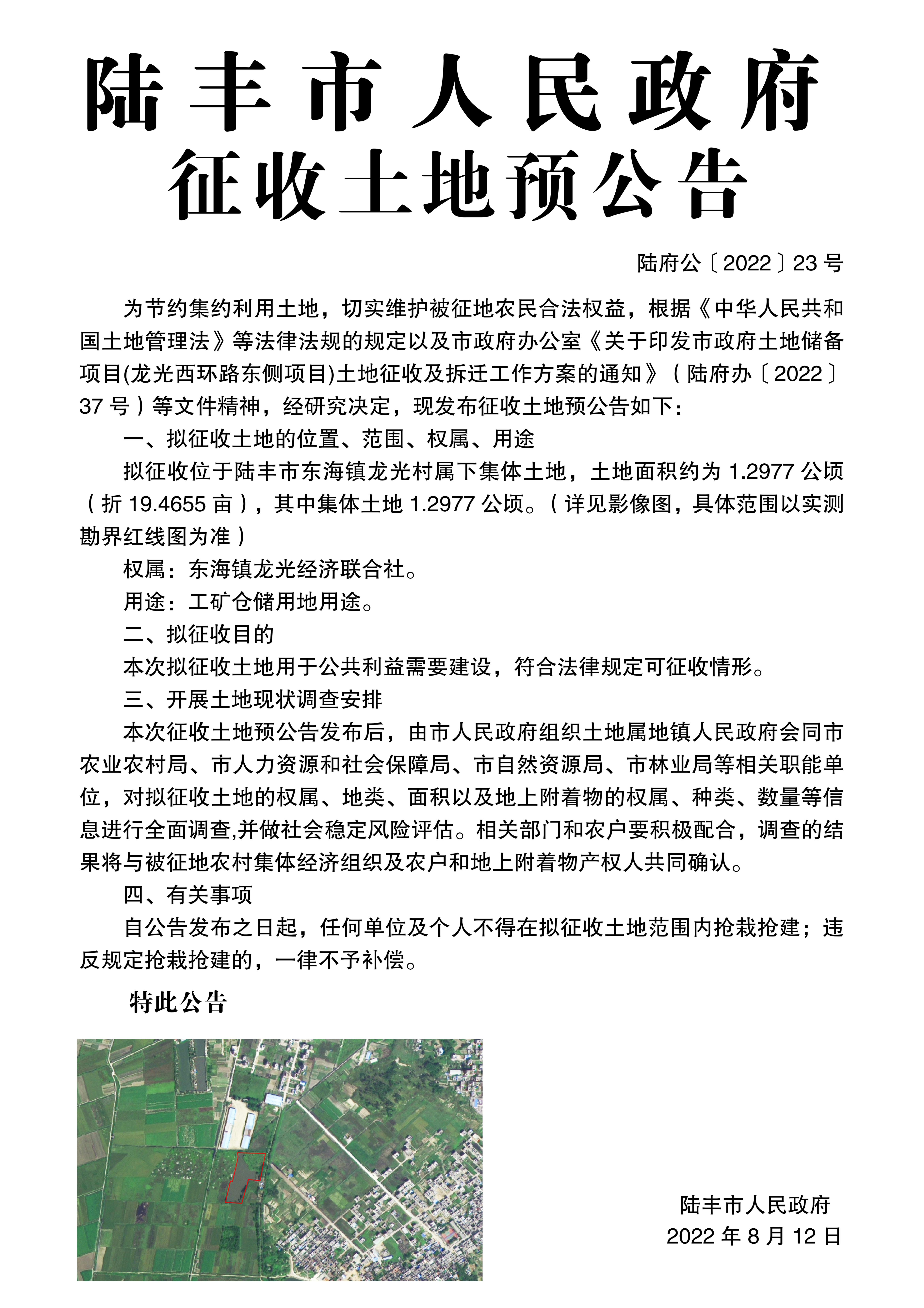 陸豐市人民政府征收土地預(yù)公告(陸府公〔2022〕23號(hào))
