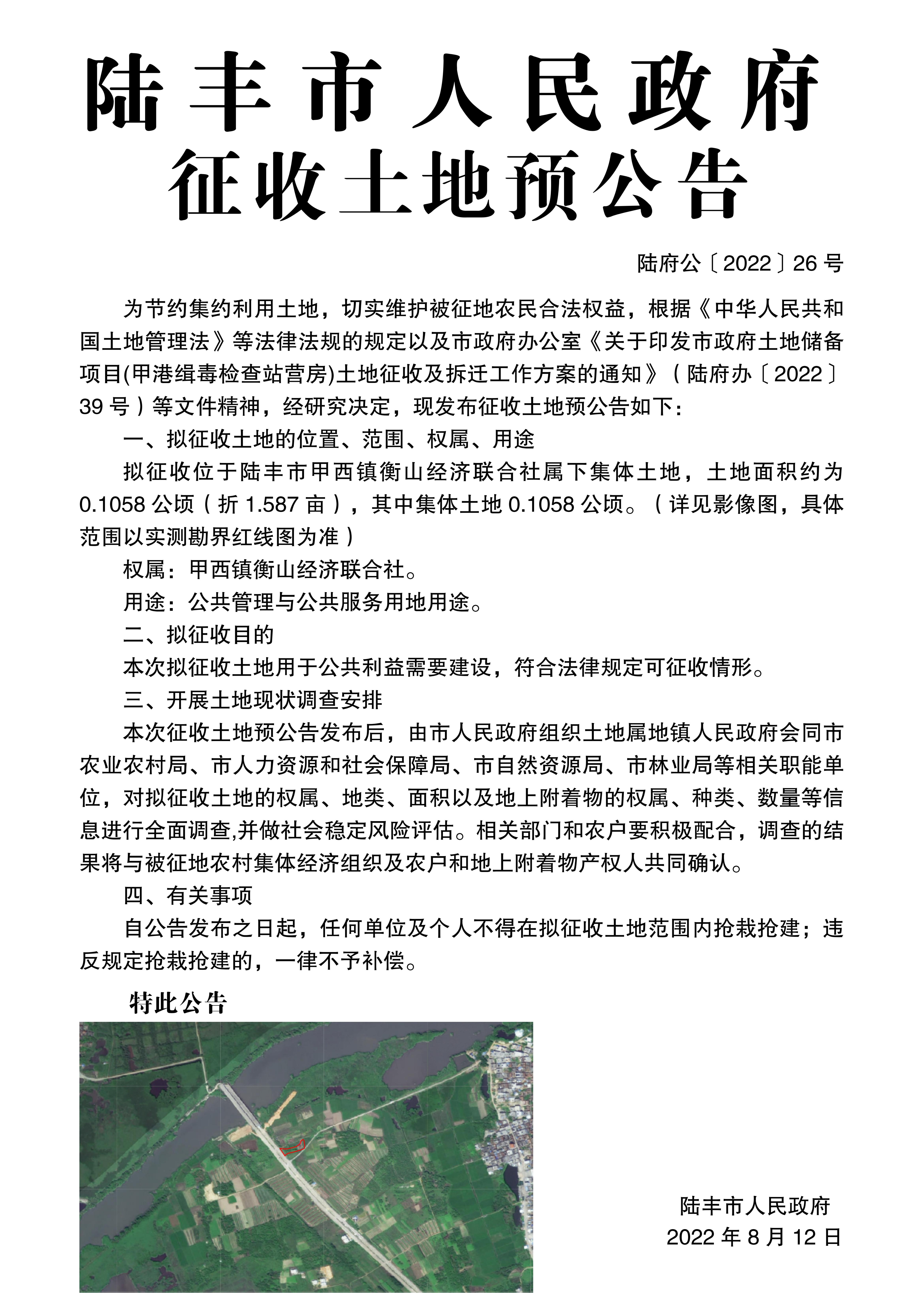陸豐市人民政府征收土地預(yù)公告(陸府公〔2022〕26號(hào)
