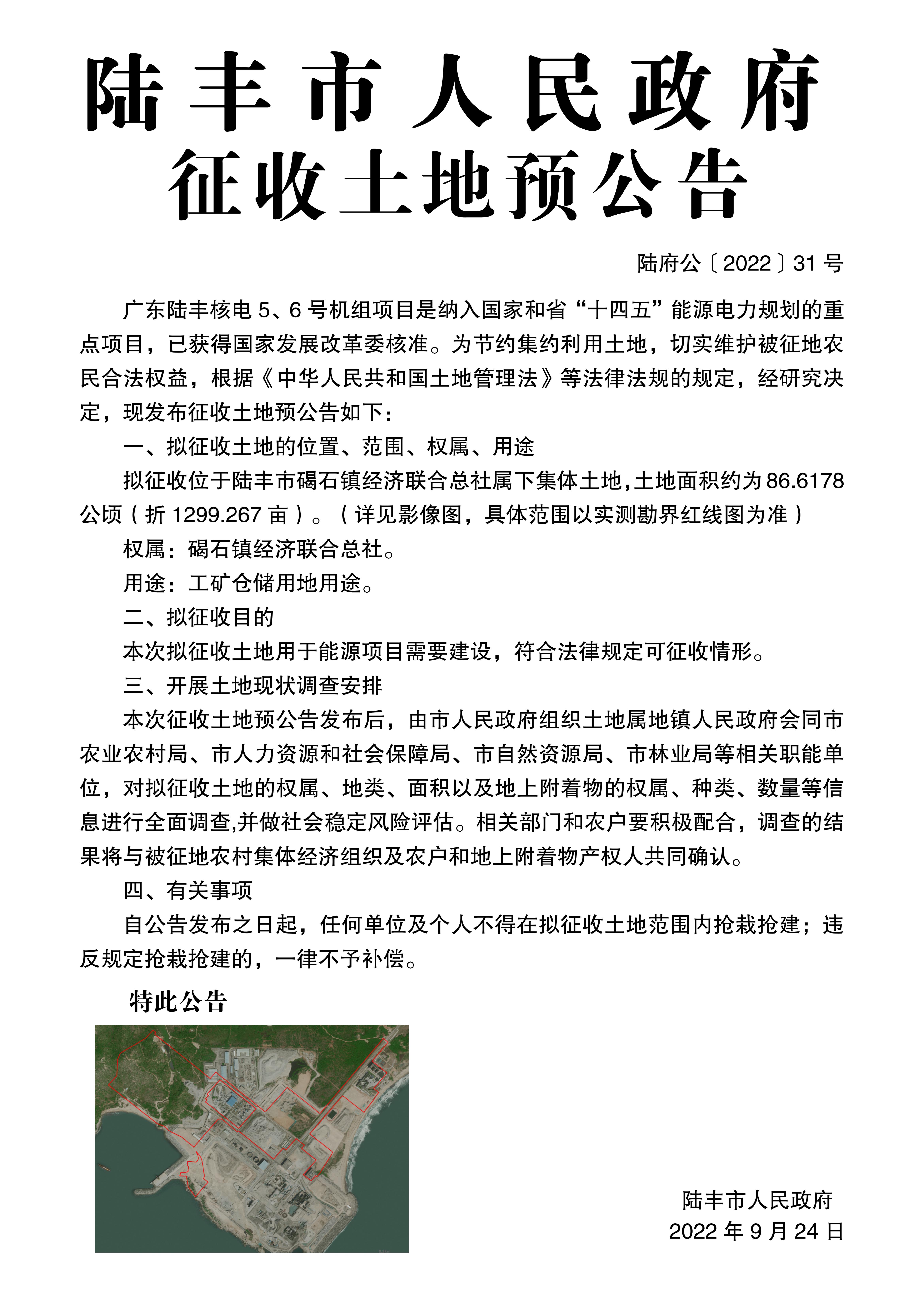 陸豐市人民政府征收土地預(yù)公告(陸府公[2022]31號(hào))