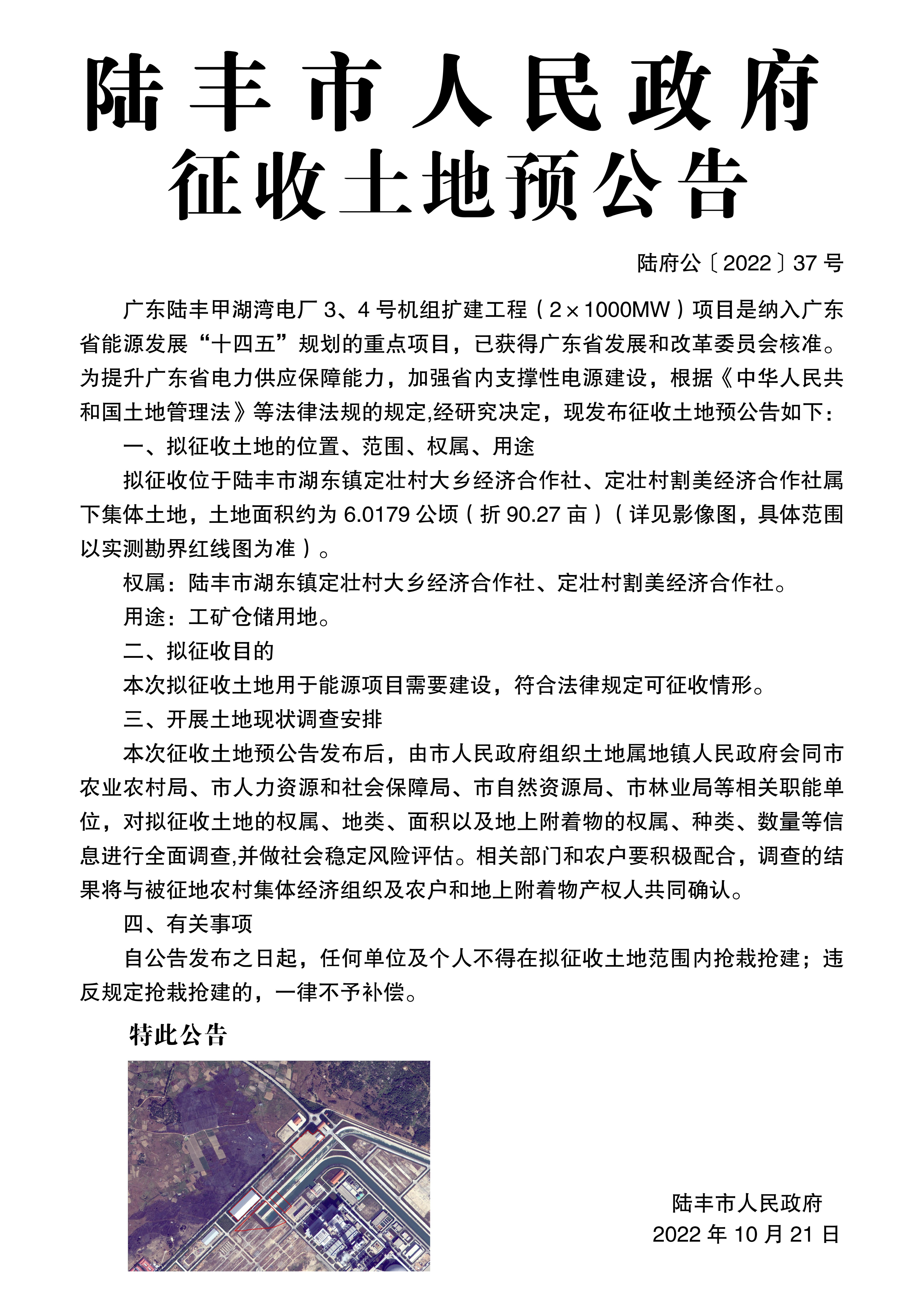 陸豐市人民政府征收土地預(yù)公告(陸府公[2022]37號)